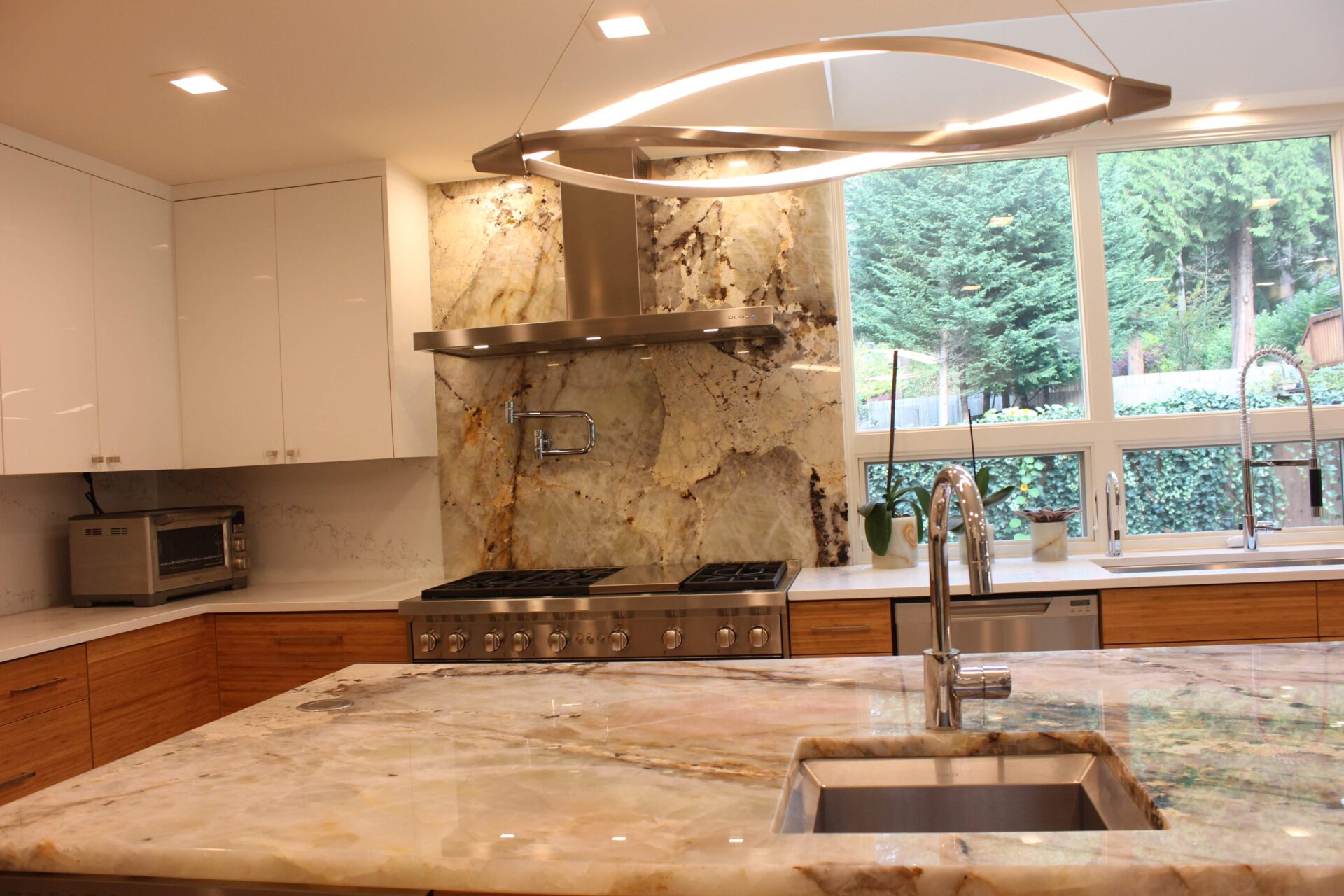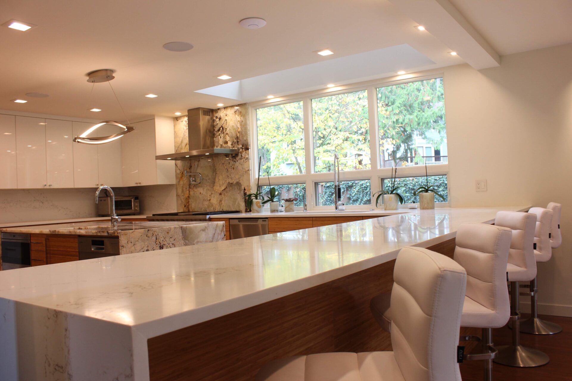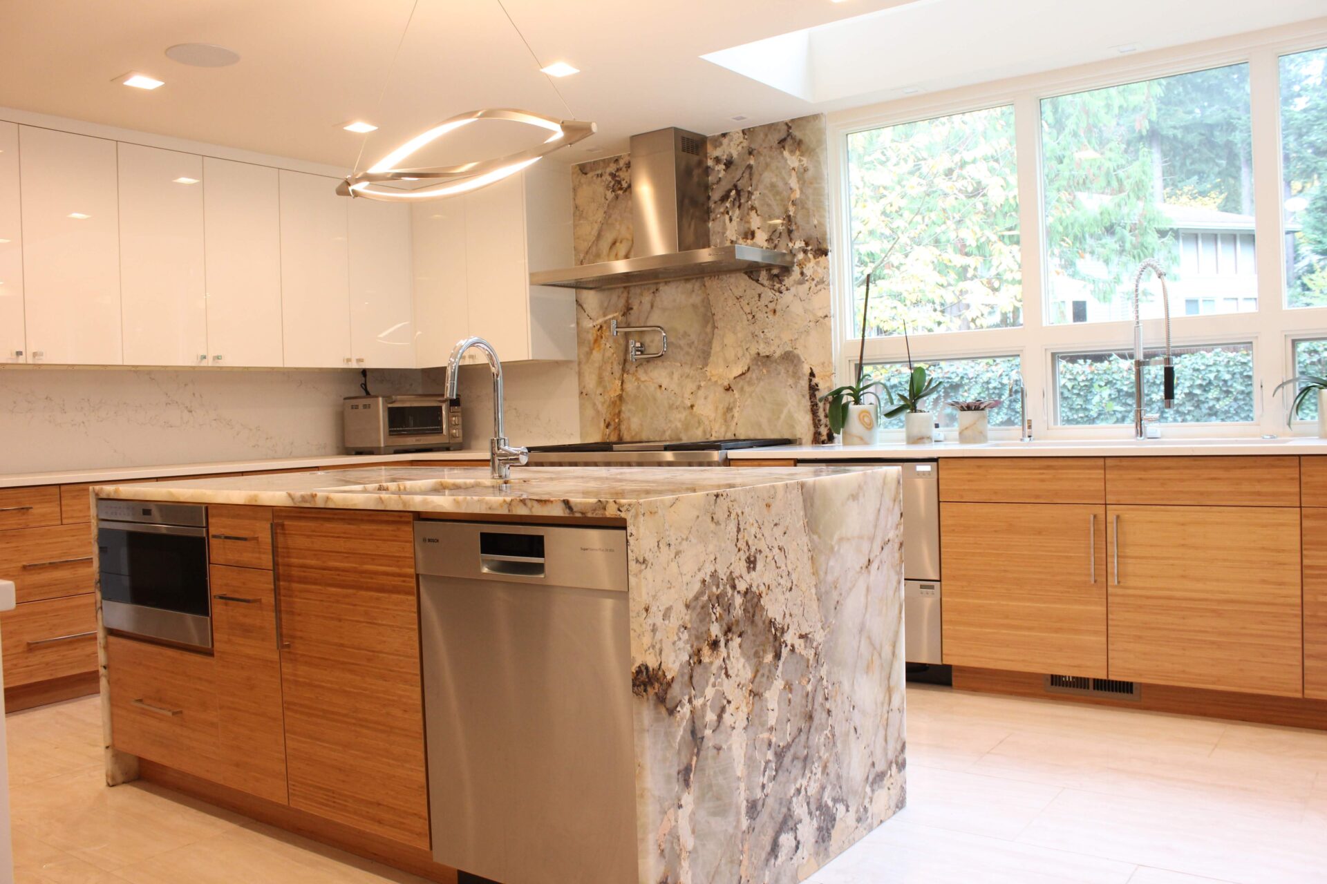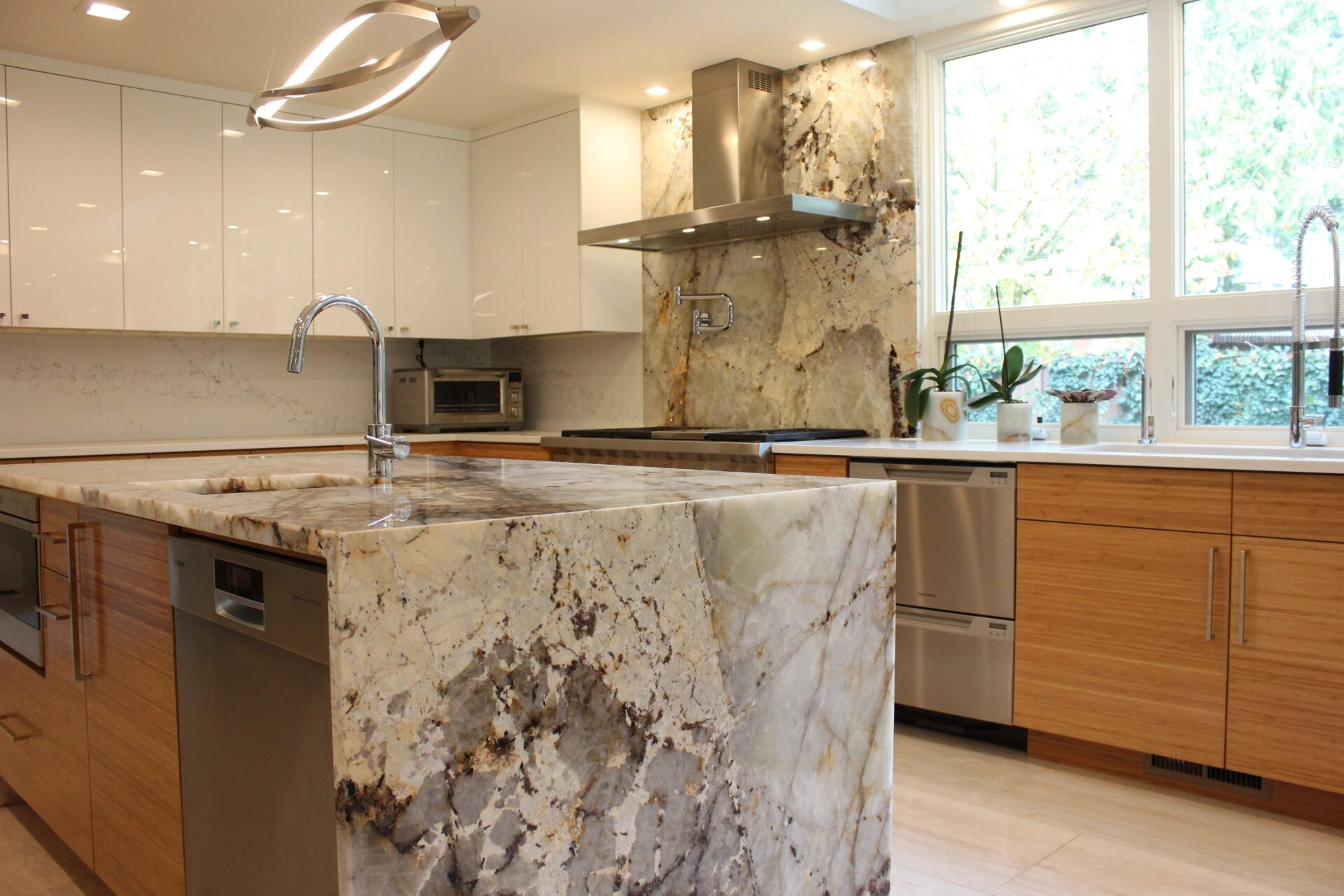 A mixture of custom built flat panel cabinetry covered with striking natural stone accenting the stove backsplash and the island with waterfalls making them the focal point of this beautiful space. The perimeter of the kitchen is lined with a faint marble looking countertops with full stone backsplash and waterfall giving this kitchen a clean and contemporary look. Quartz and natural stone is used throughout the home.