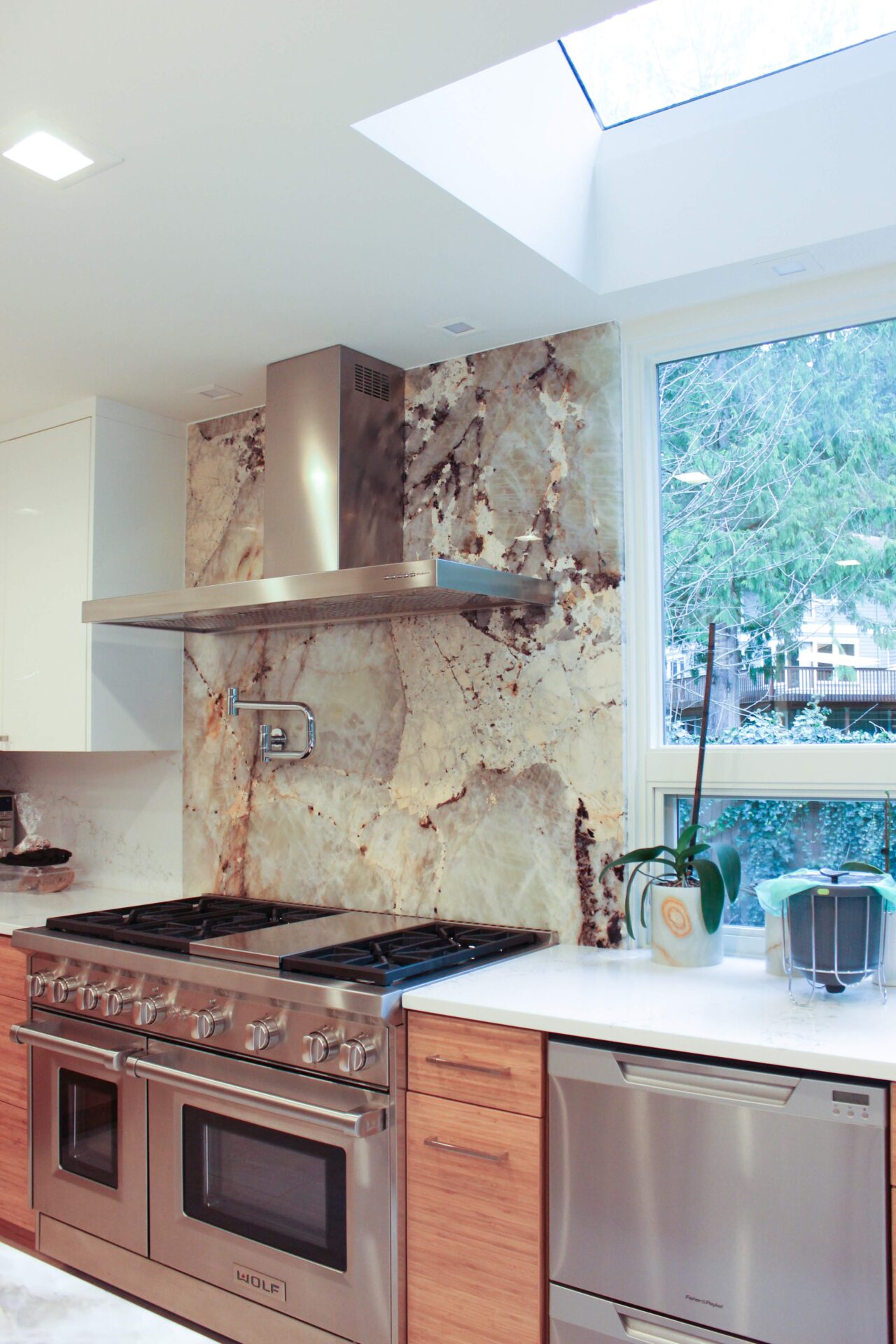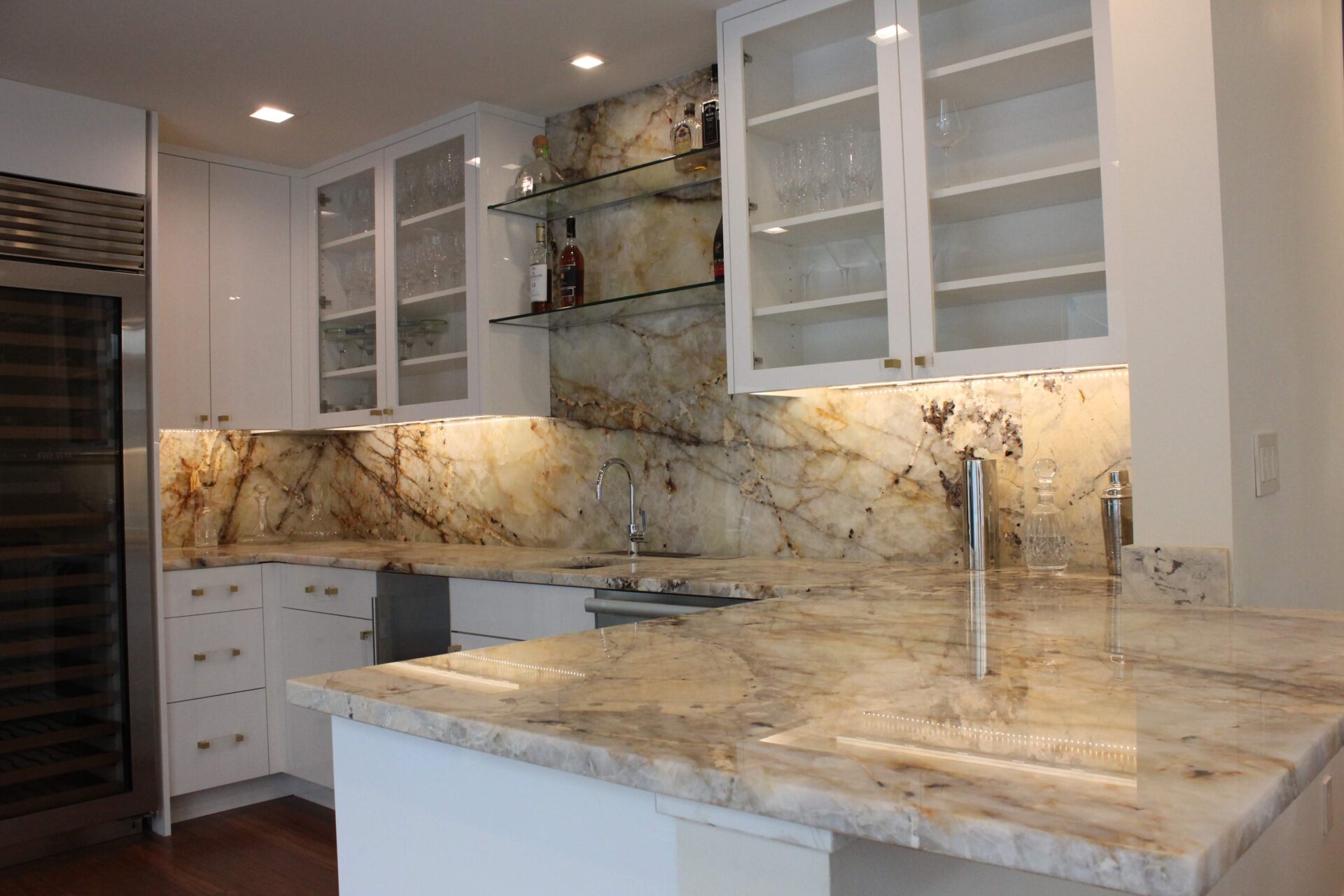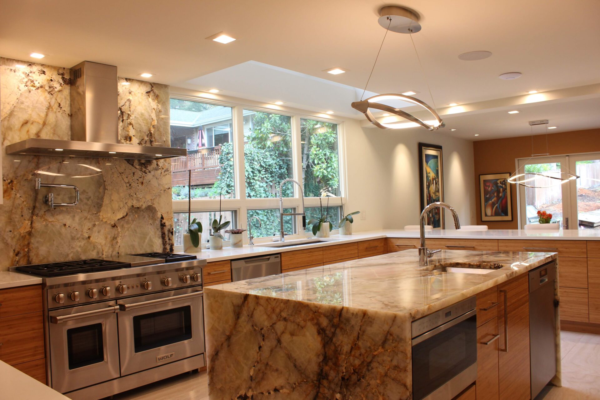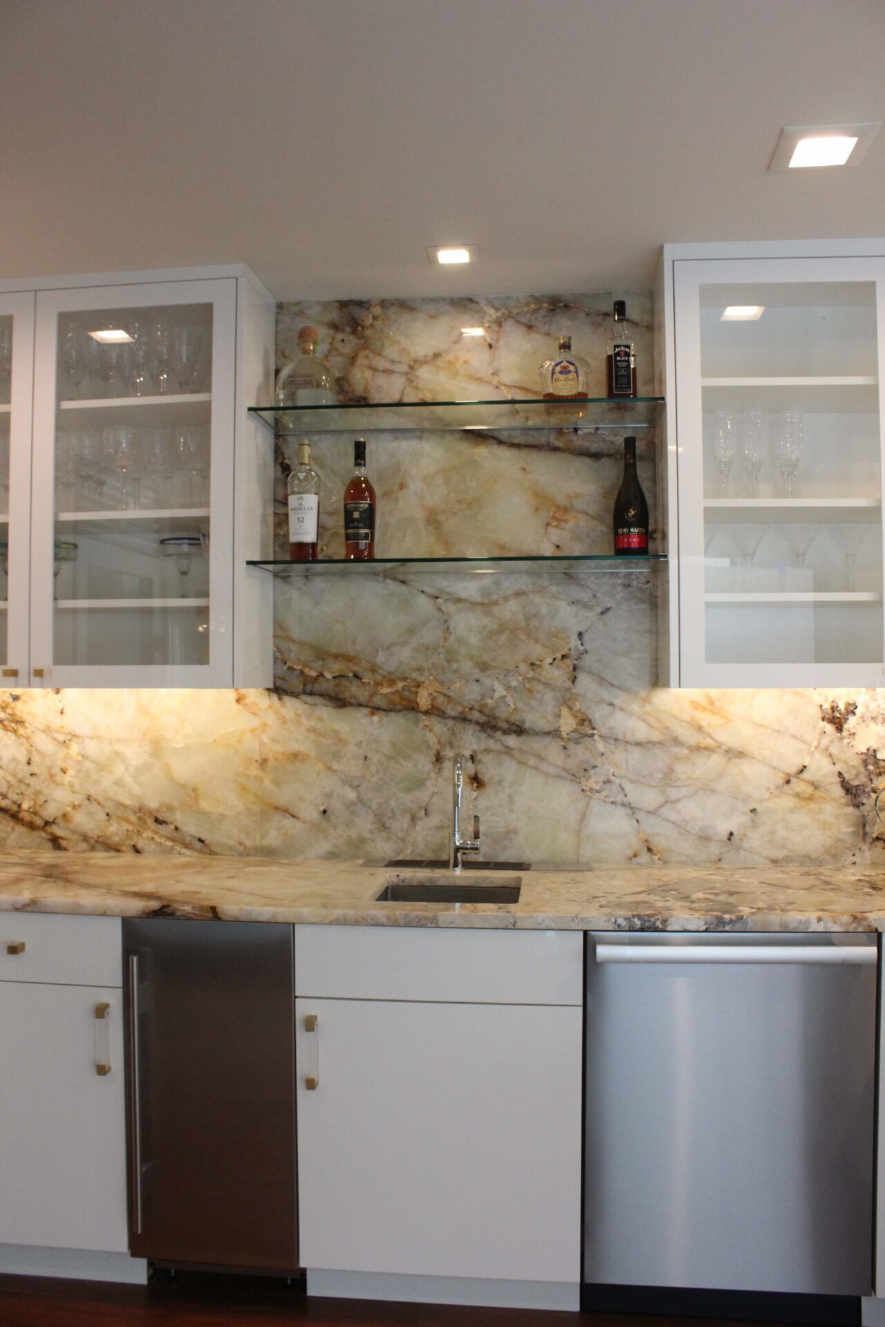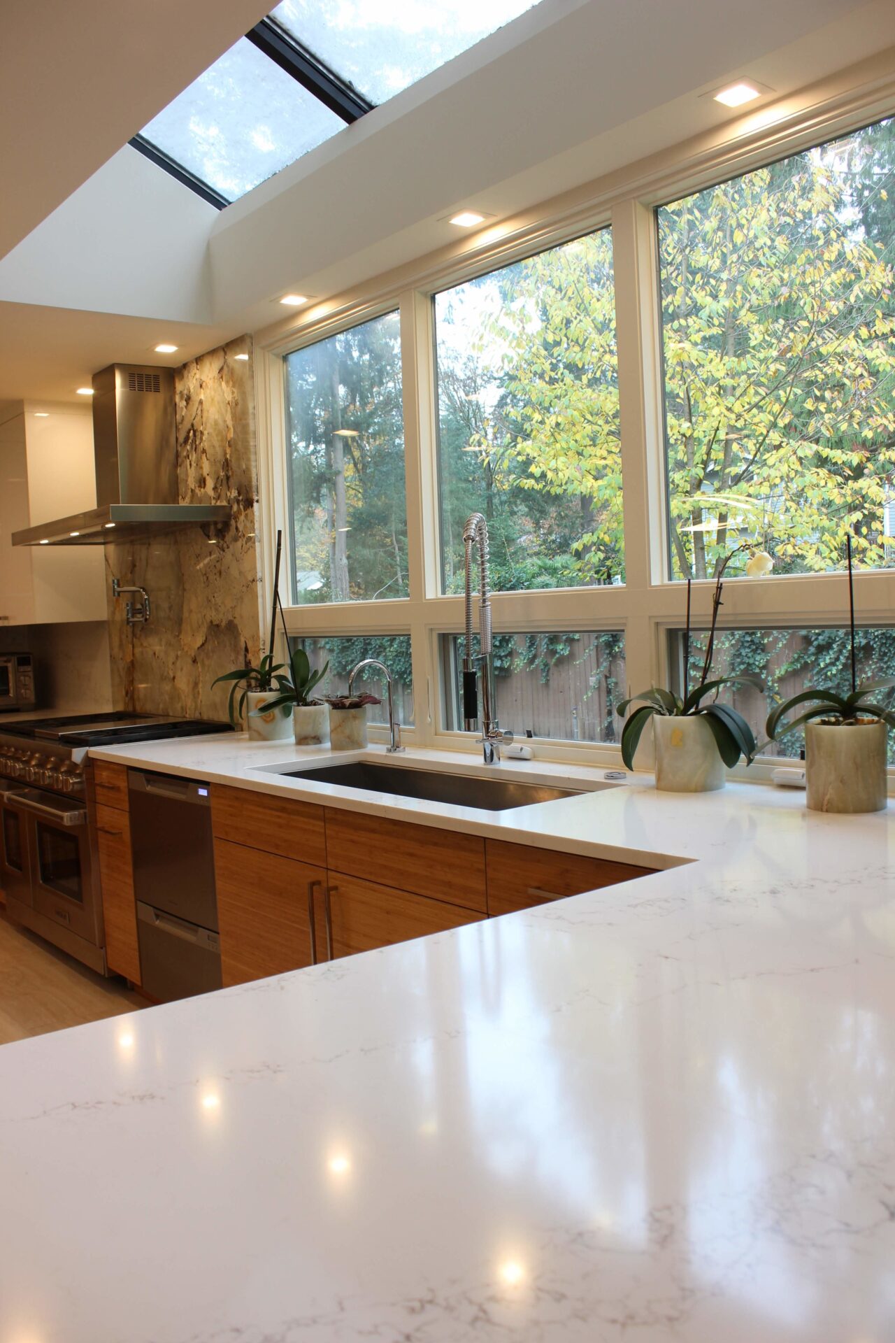 A mixture of custom built flat panel cabinetry covered with striking natural stone accenting the stove backsplash and the island with waterfalls making them the focal point of this beautiful space. The perimeter of the kitchen is lined with a faint marble looking countertops with full stone backsplash and waterfall giving this kitchen a clean and contemporary look. Quartz and natural stone is used throughout the home.