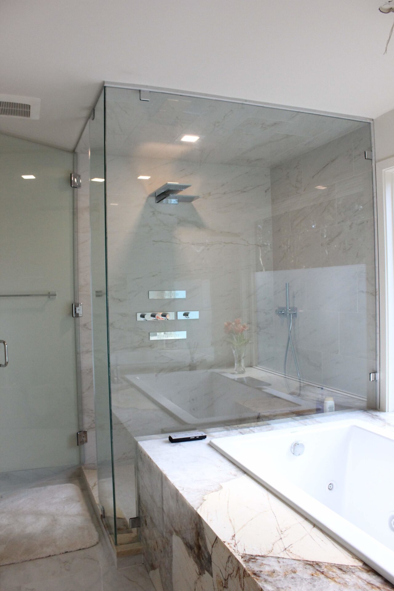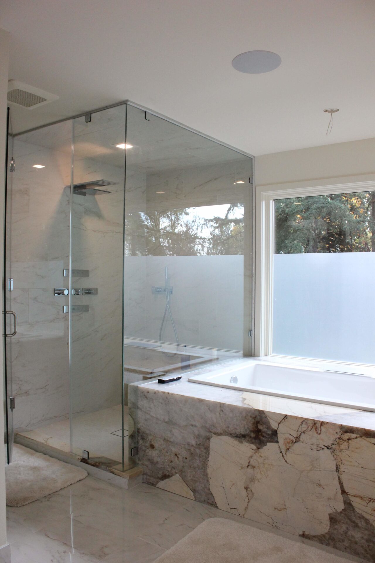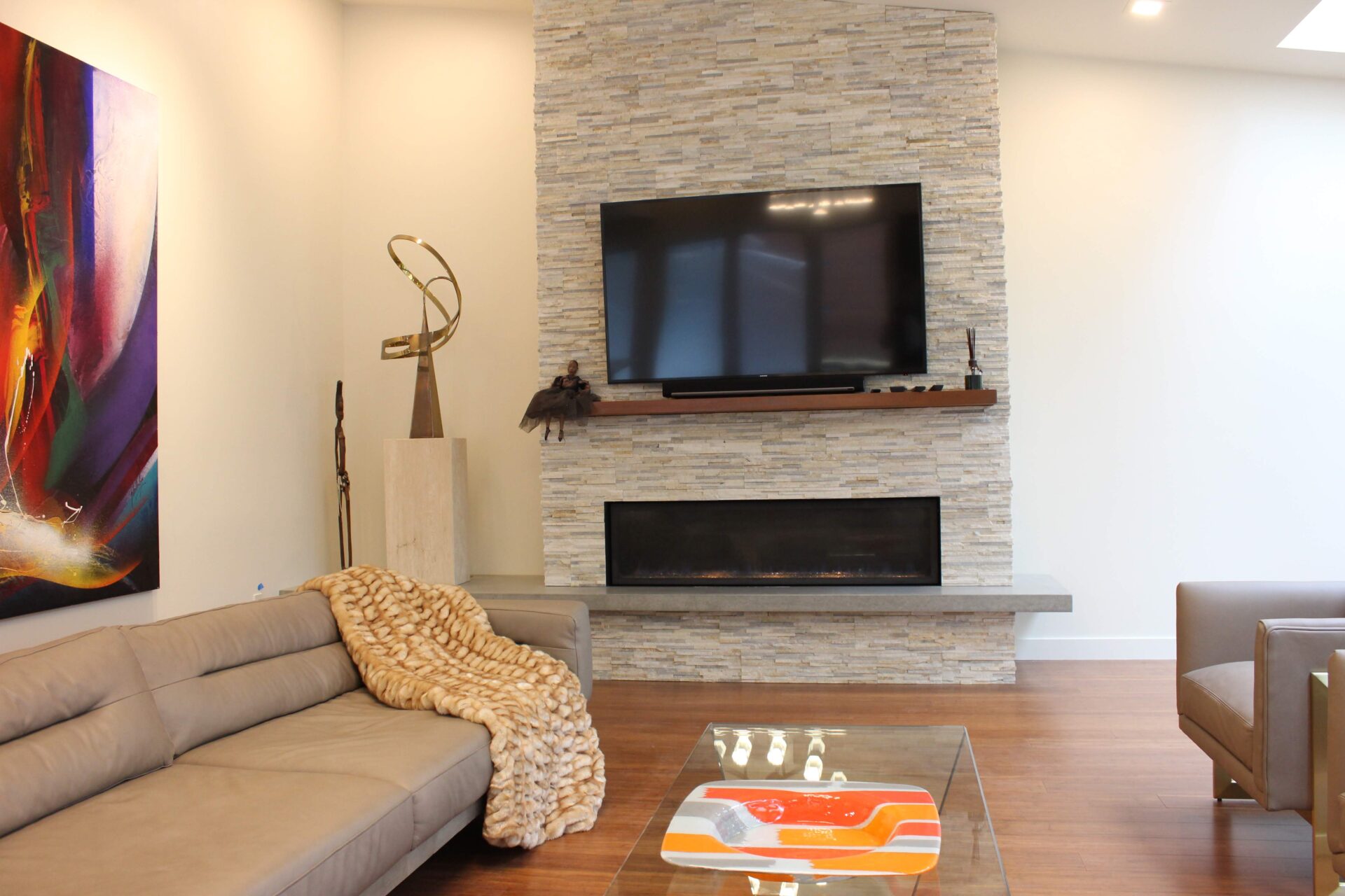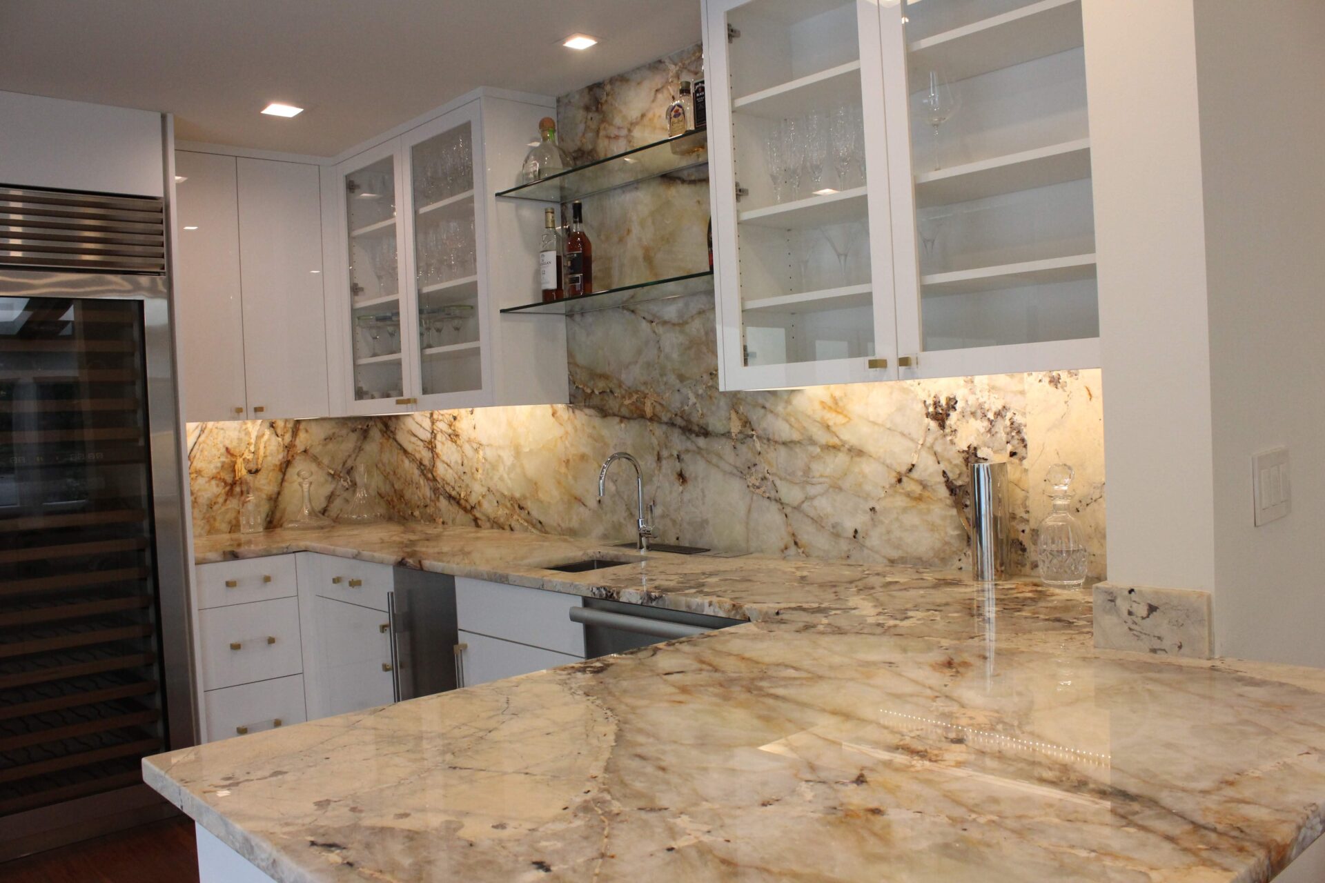 A mixture of custom built flat panel cabinetry covered with striking natural stone accenting the stove backsplash and the island with waterfalls making them the focal point of this beautiful space. The perimeter of the kitchen is lined with a faint marble looking countertops with full stone backsplash and waterfall giving this kitchen a clean and contemporary look. Quartz and natural stone is used throughout the home.