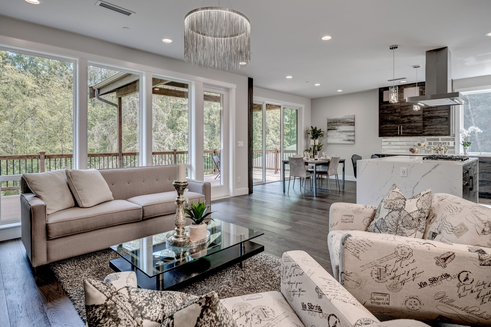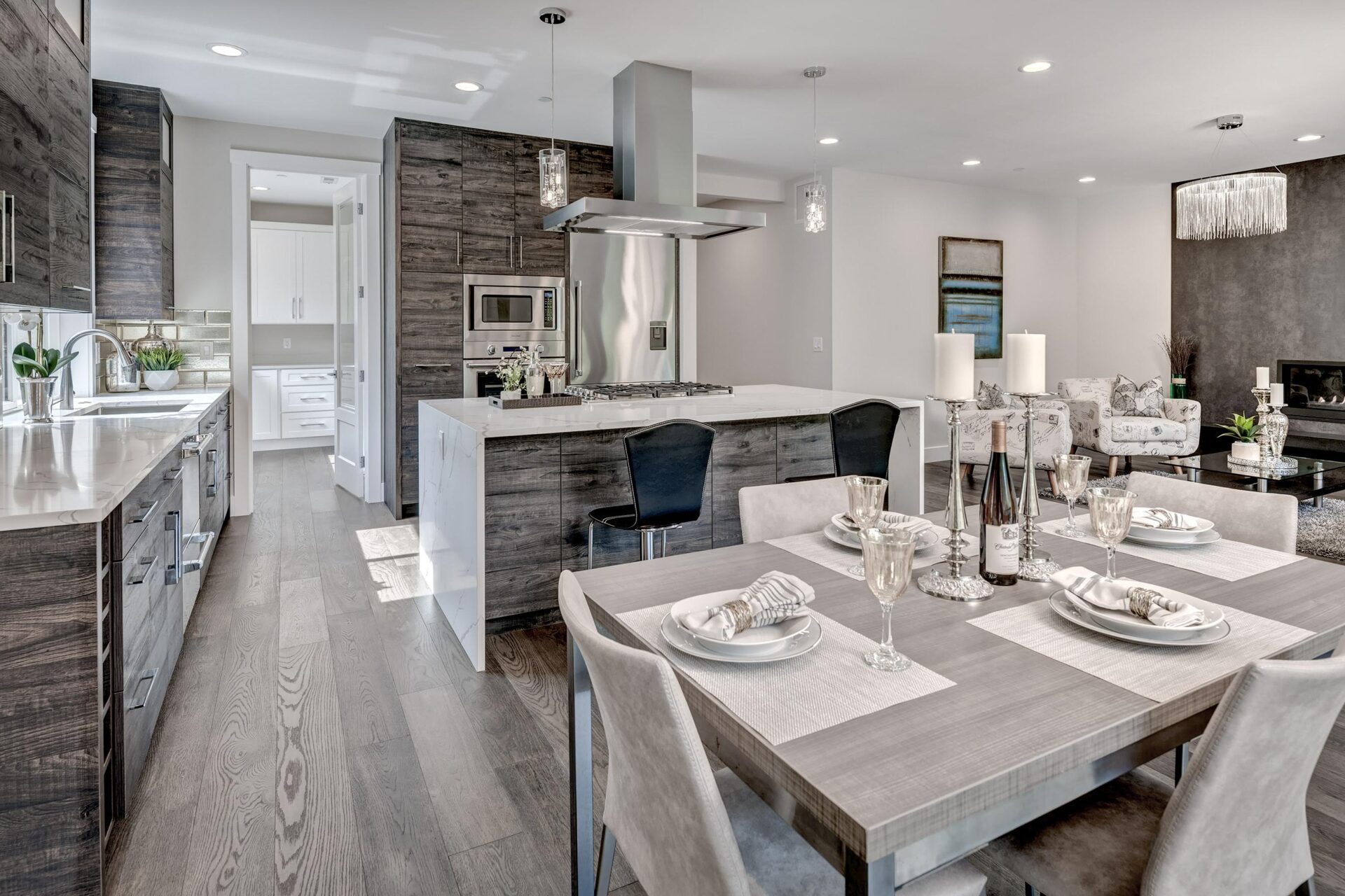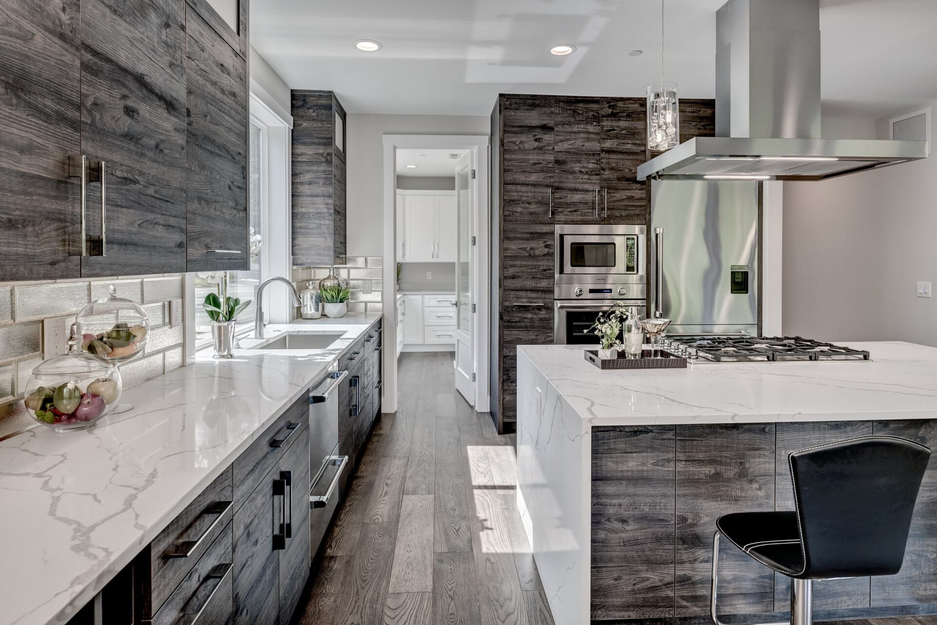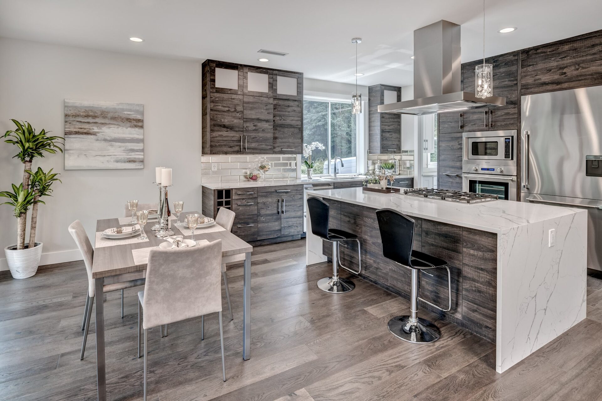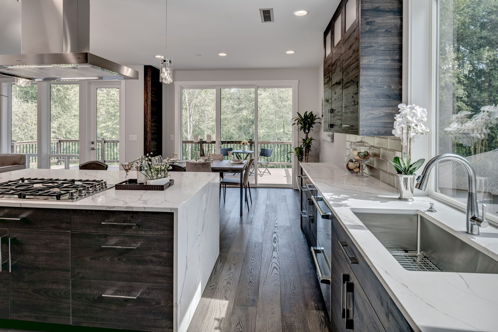 The home features floor to ceiling windows and glass doors, creating a nature’s get away feel for the homeowners and an escape from the hustle and bustle of city life. The open layout provides ideal sight-lines throughout the main living area. Custom built kitchen is the highlight of this home featuring dark stained flat panel cabinetry and marble looking quartz countertops, creating an ideal space for a weekend entertainment or a busy Monday morning. Minimal and contrasting features of the backsplash, countertops and cabinetry gives the space a clean and striking look.