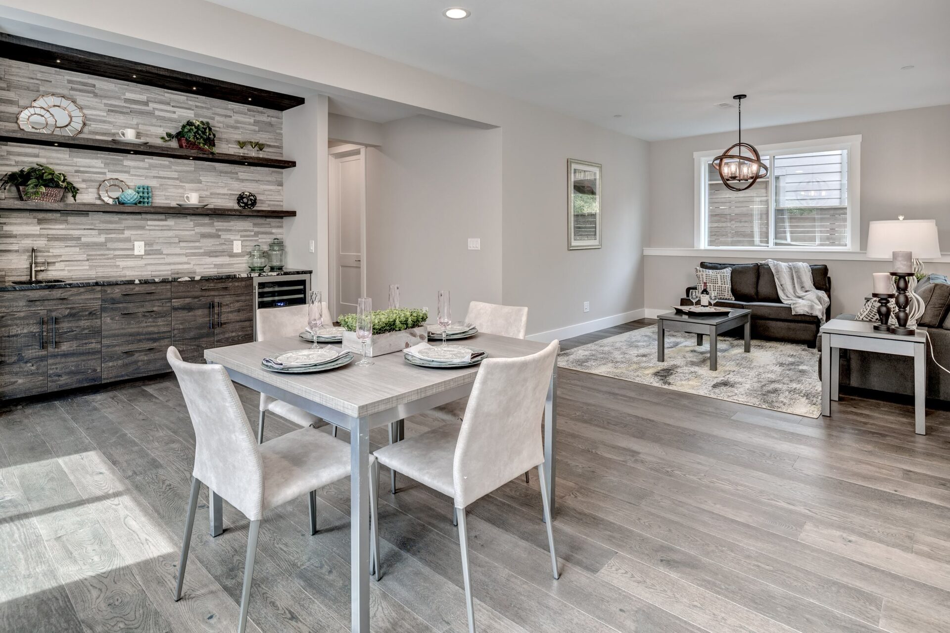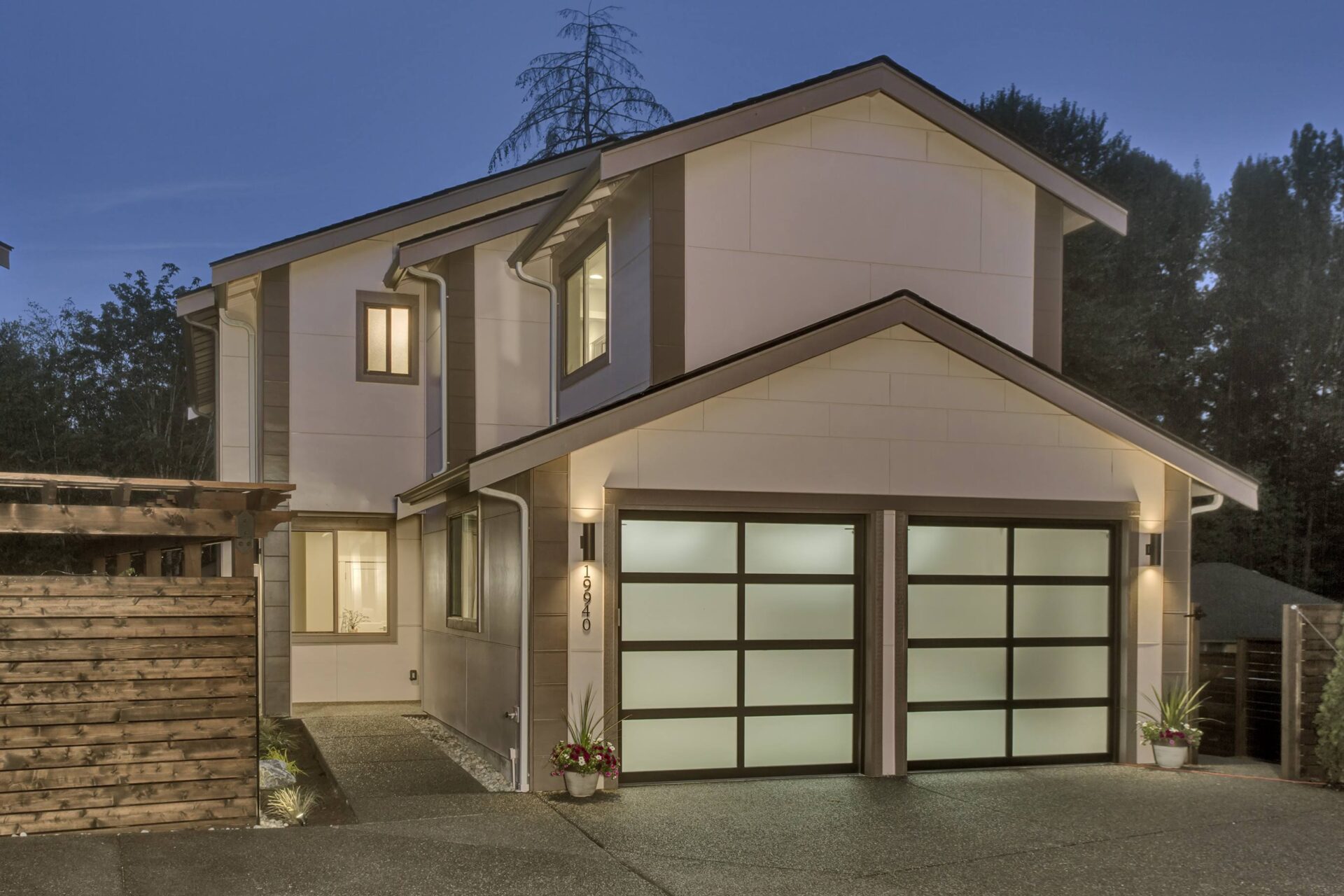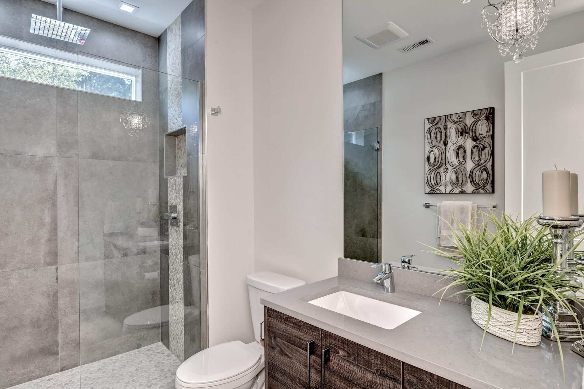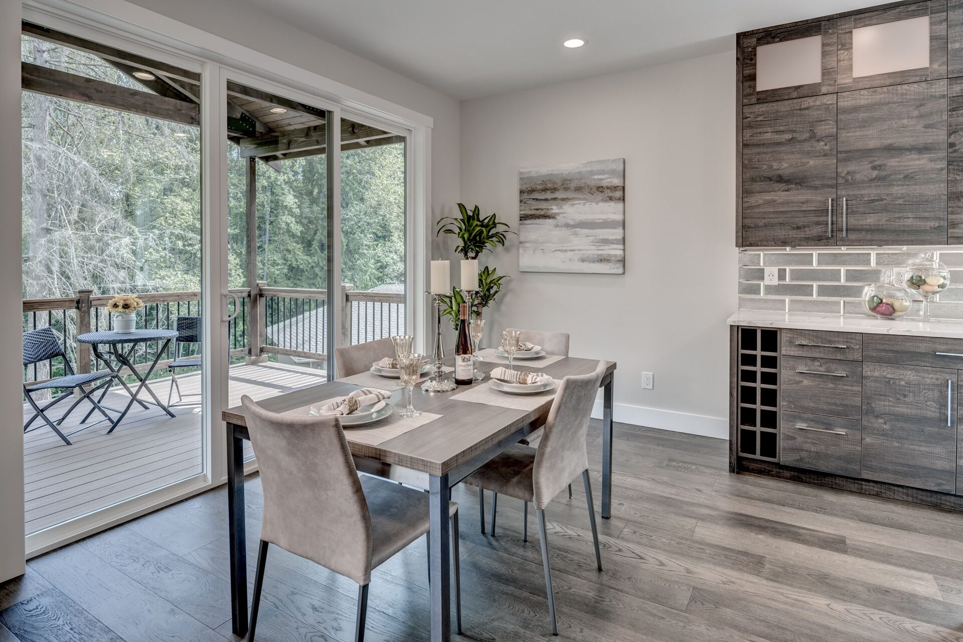 The home features floor to ceiling windows and glass doors, creating a nature’s get away feel for the homeowners and an escape from the hustle and bustle of city life. The open layout provides ideal sight-lines throughout the main living area. Custom built kitchen is the highlight of this home featuring dark stained flat panel cabinetry and marble looking quartz countertops, creating an ideal space for a weekend entertainment or a busy Monday morning. Minimal and contrasting features of the backsplash, countertops and cabinetry gives the space a clean and striking look.