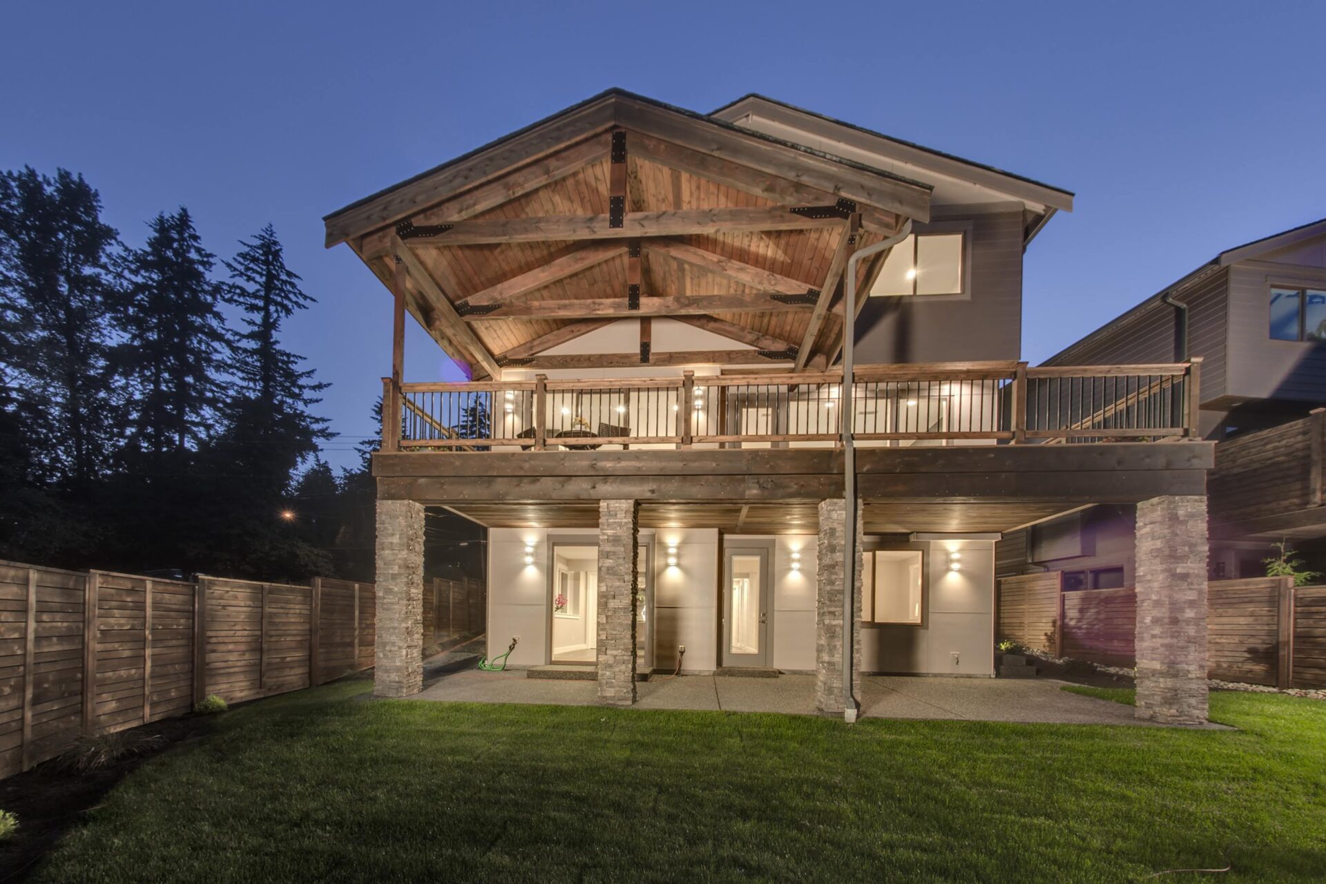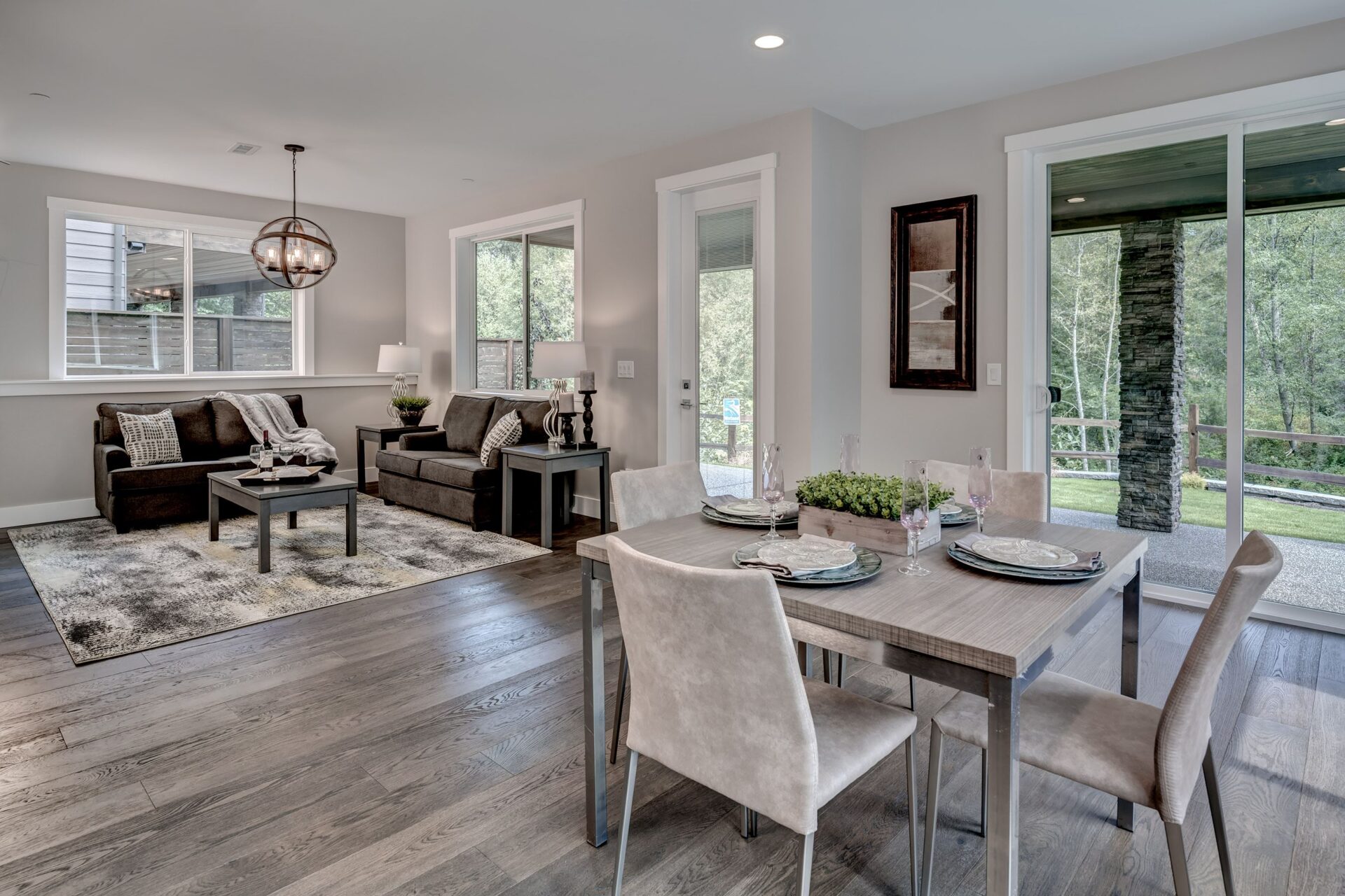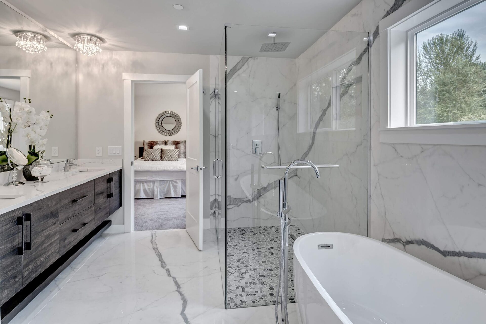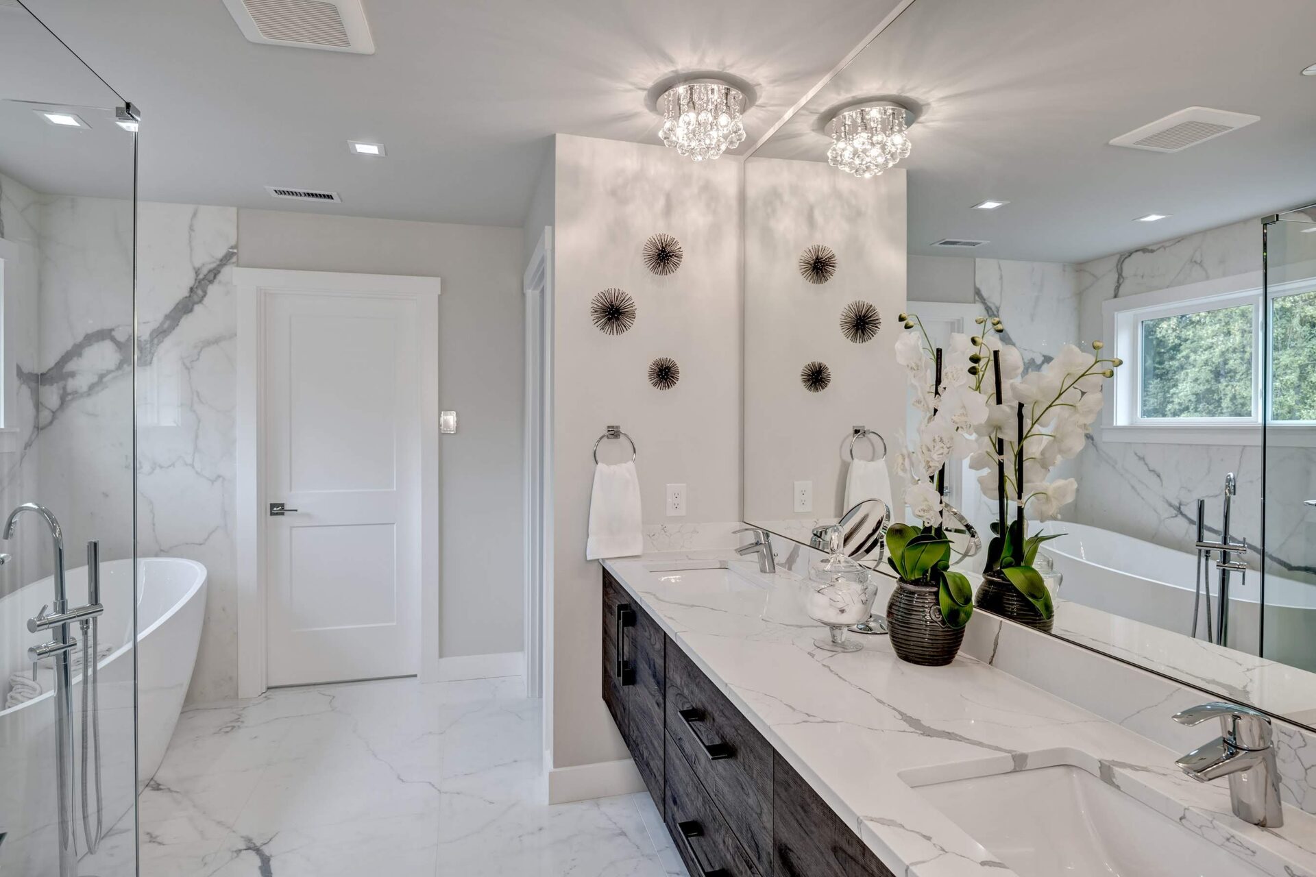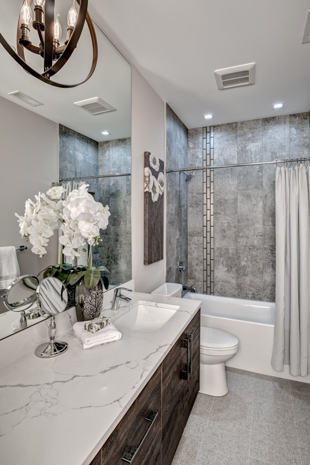 The home features floor to ceiling windows and glass doors, creating a nature’s get away feel for the homeowners and an escape from the hustle and bustle of city life. The open layout provides ideal sight-lines throughout the main living area. Custom built kitchen is the highlight of this home featuring dark stained flat panel cabinetry and marble looking quartz countertops, creating an ideal space for a weekend entertainment or a busy Monday morning. Minimal and contrasting features of the backsplash, countertops and cabinetry gives the space a clean and striking look.