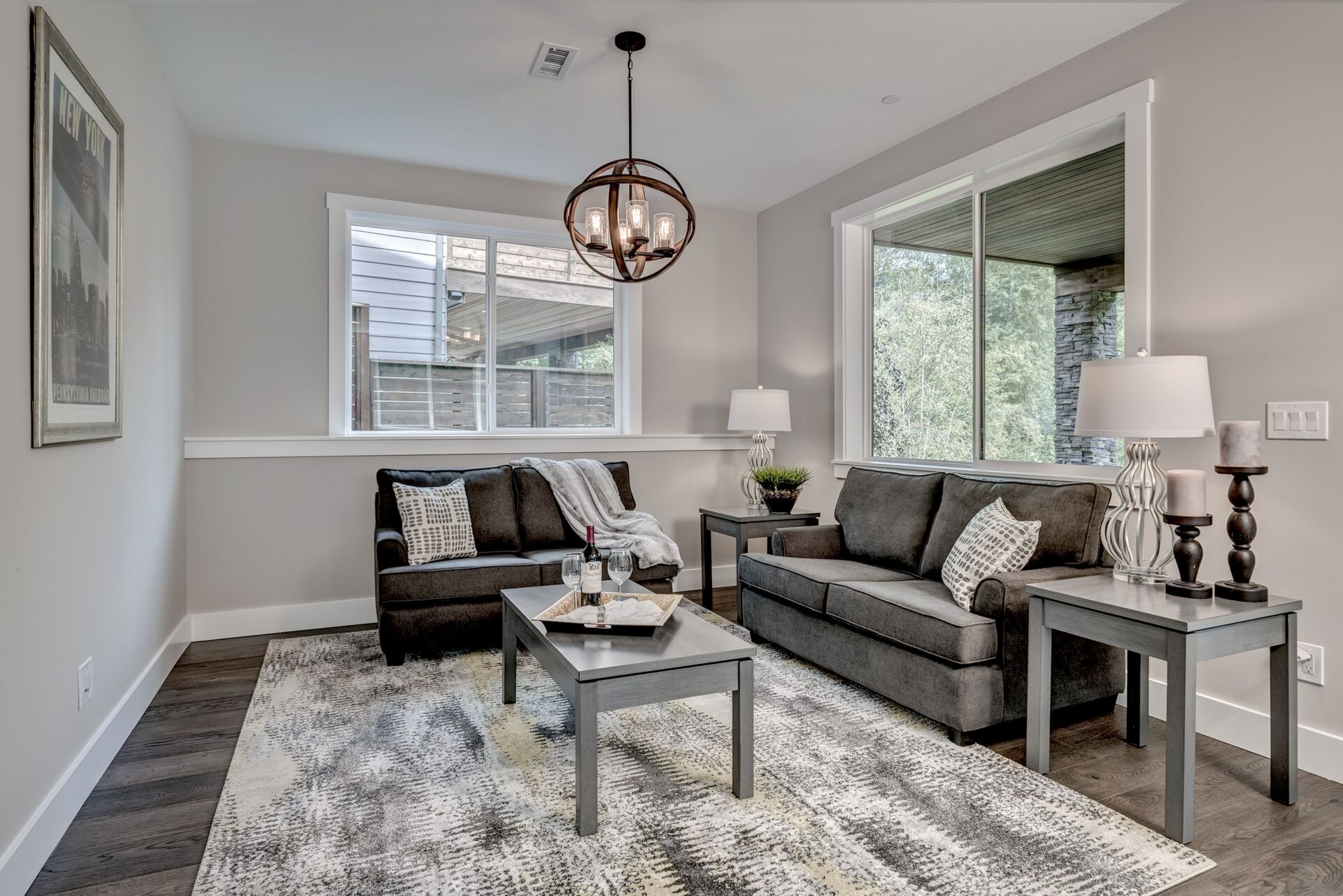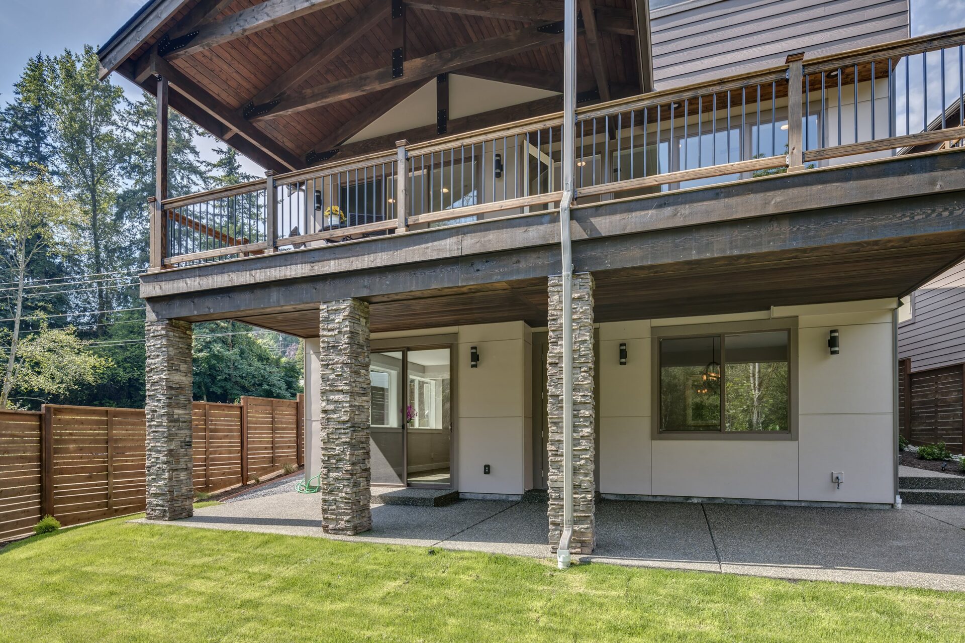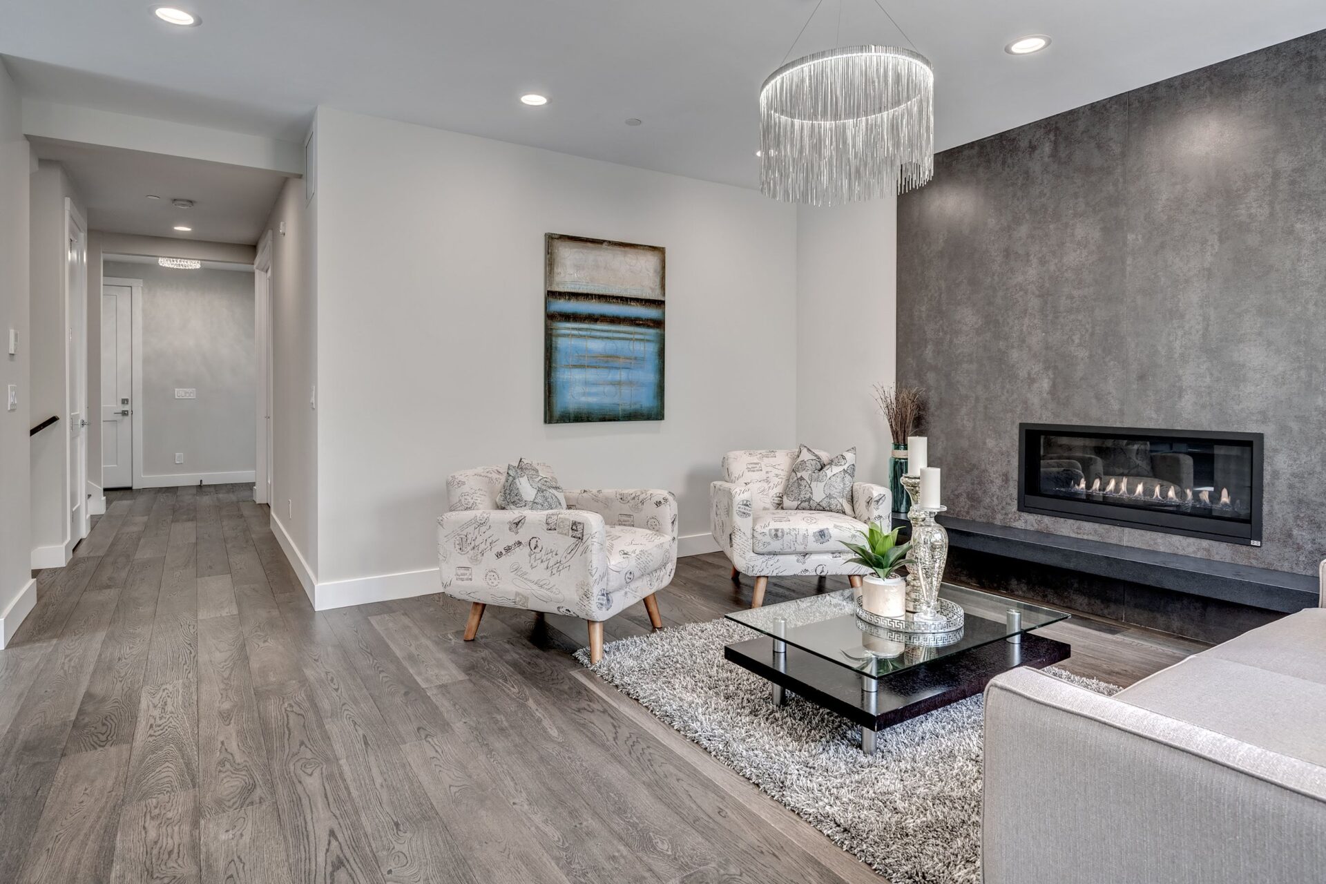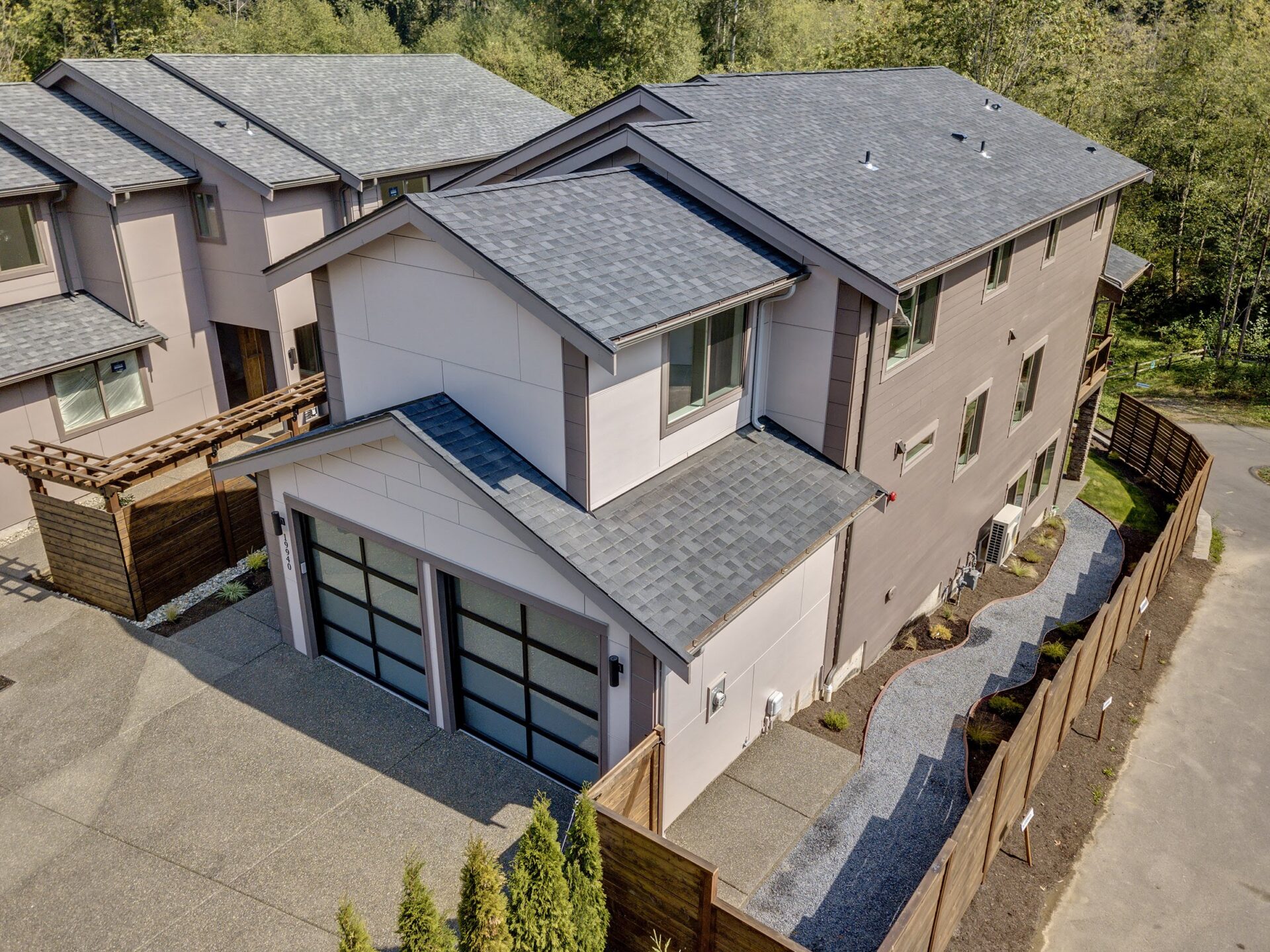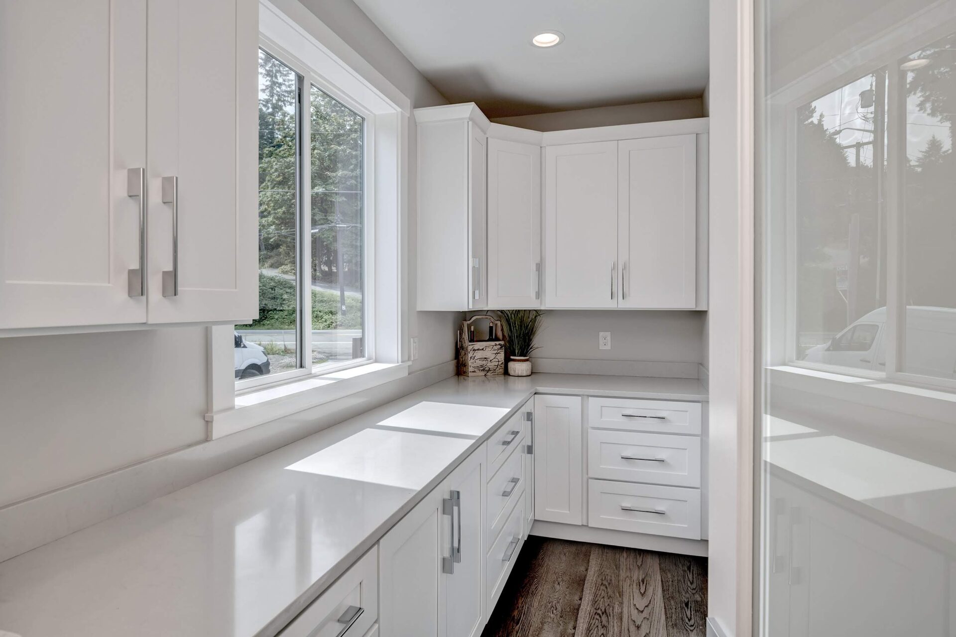 The home features floor to ceiling windows and glass doors, creating a nature’s get away feel for the homeowners and an escape from the hustle and bustle of city life. The open layout provides ideal sight-lines throughout the main living area. Custom built kitchen is the highlight of this home featuring dark stained flat panel cabinetry and marble looking quartz countertops, creating an ideal space for a weekend entertainment or a busy Monday morning. Minimal and contrasting features of the backsplash, countertops and cabinetry gives the space a clean and striking look.