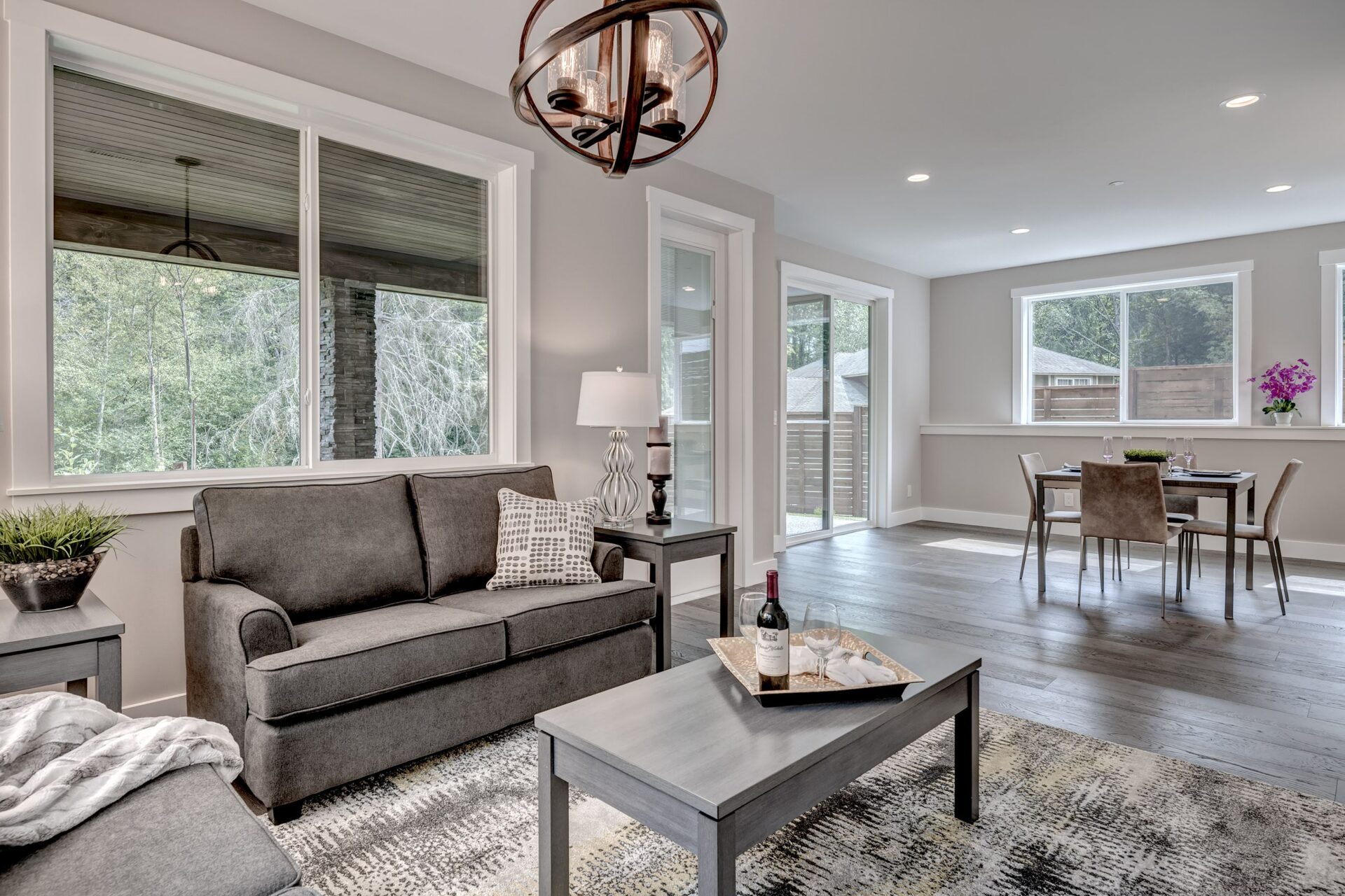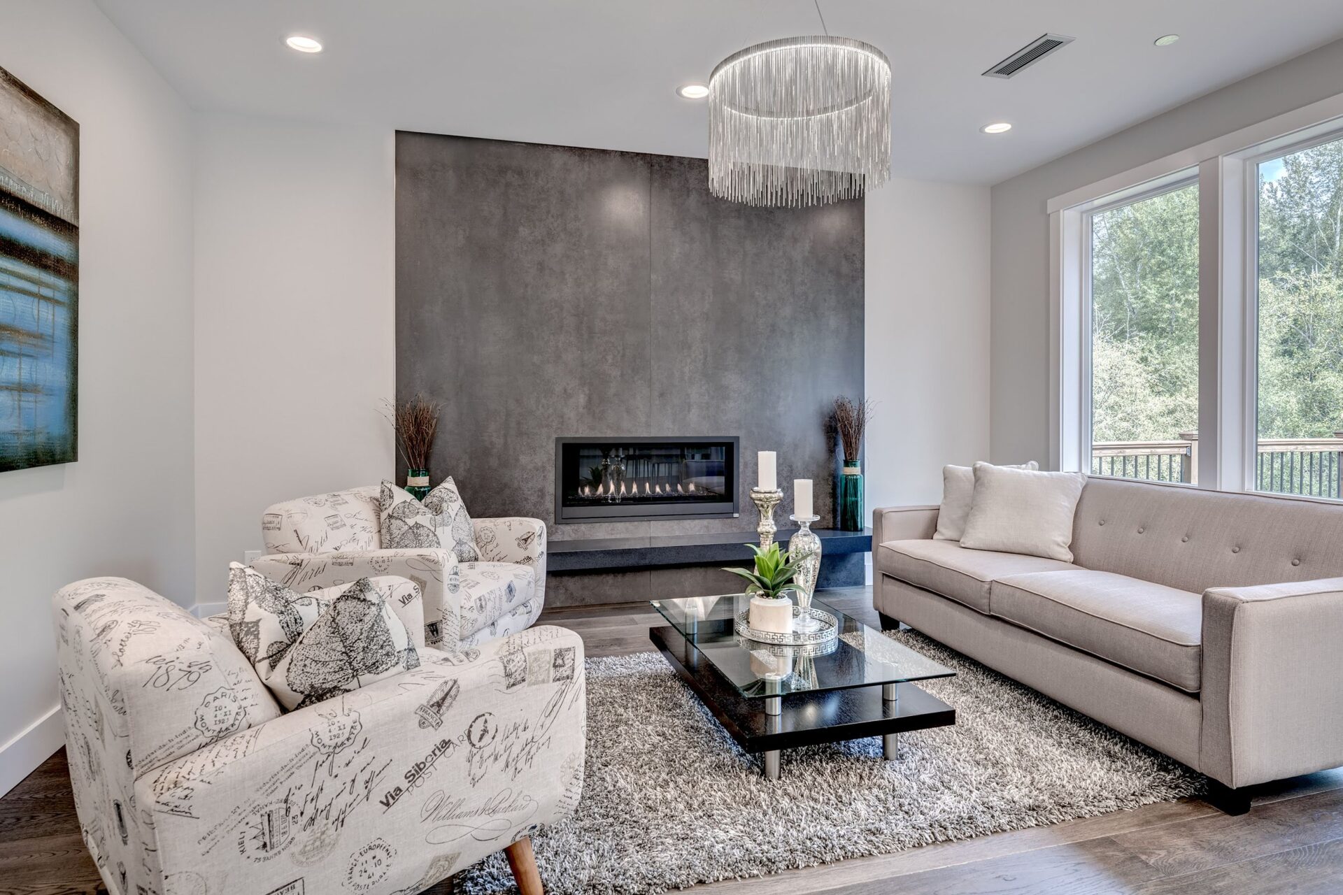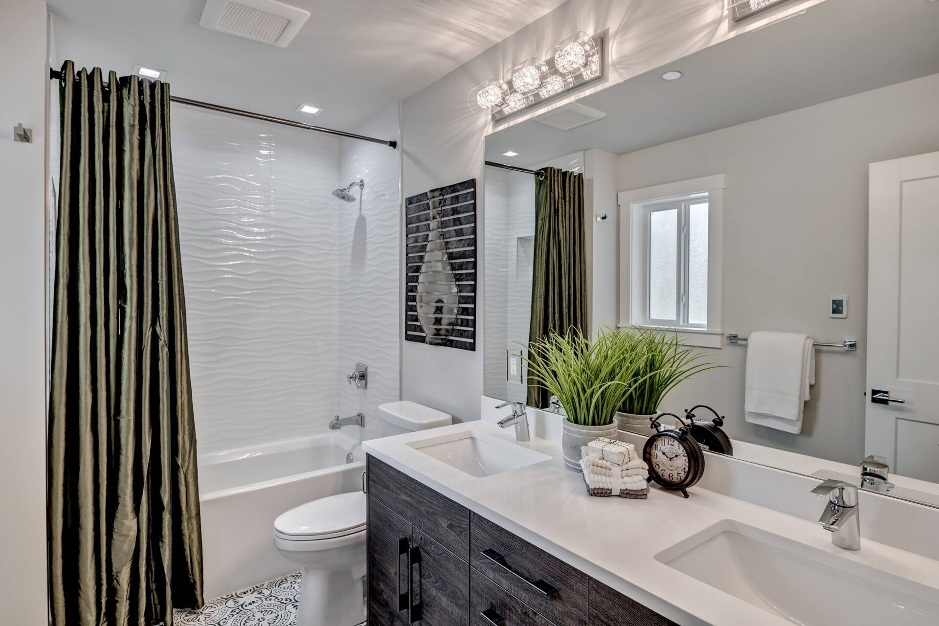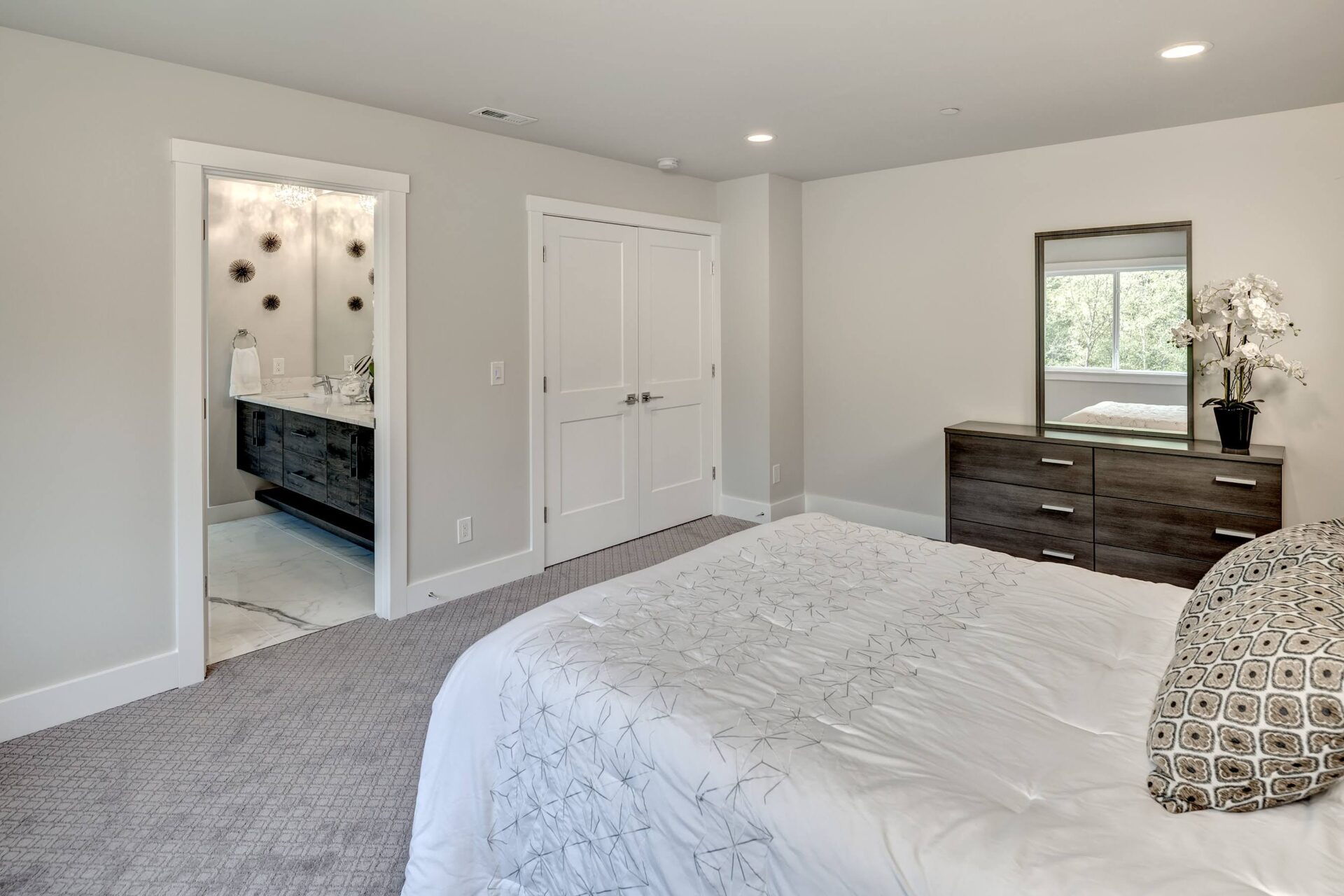 The home features floor to ceiling windows and glass doors, creating a nature’s get away feel for the homeowners and an escape from the hustle and bustle of city life. The open layout provides ideal sight-lines throughout the main living area. Custom built kitchen is the highlight of this home featuring dark stained flat panel cabinetry and marble looking quartz countertops, creating an ideal space for a weekend entertainment or a busy Monday morning. Minimal and contrasting features of the backsplash, countertops and cabinetry gives the space a clean and striking look.