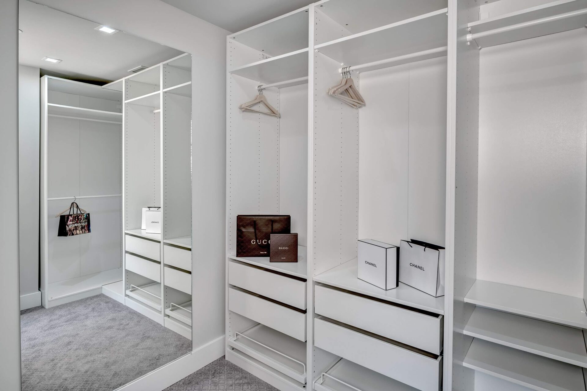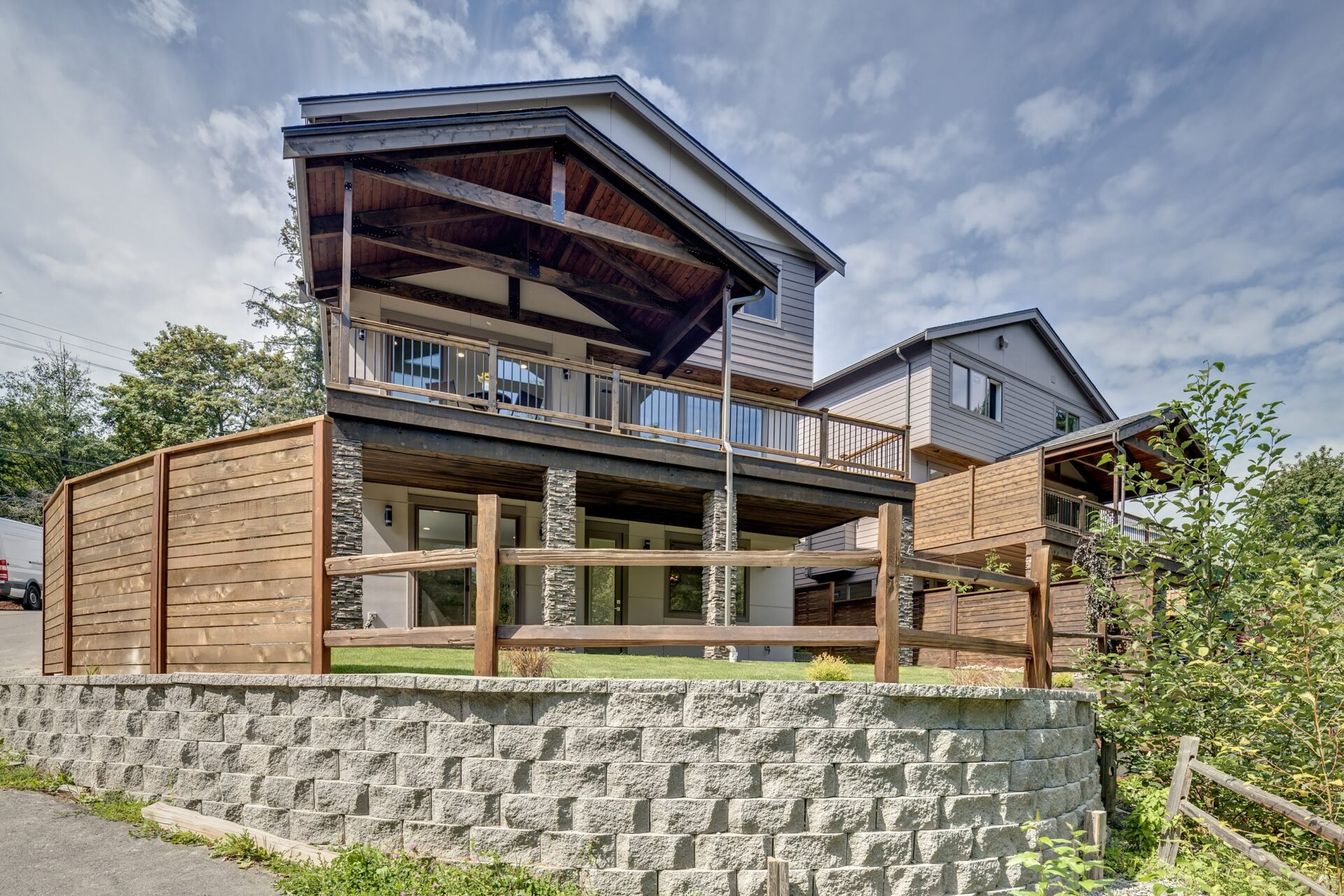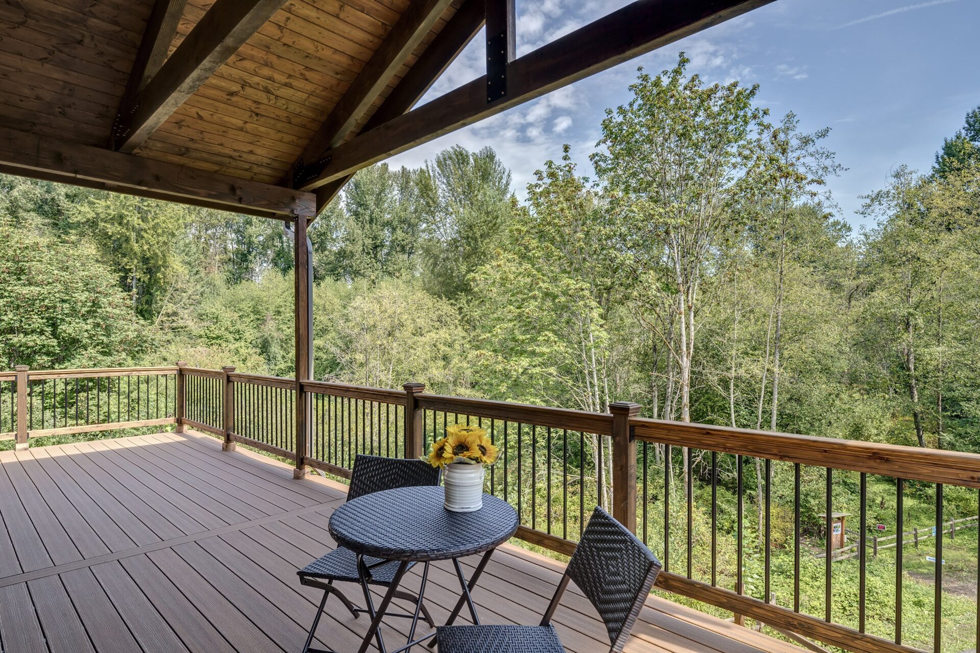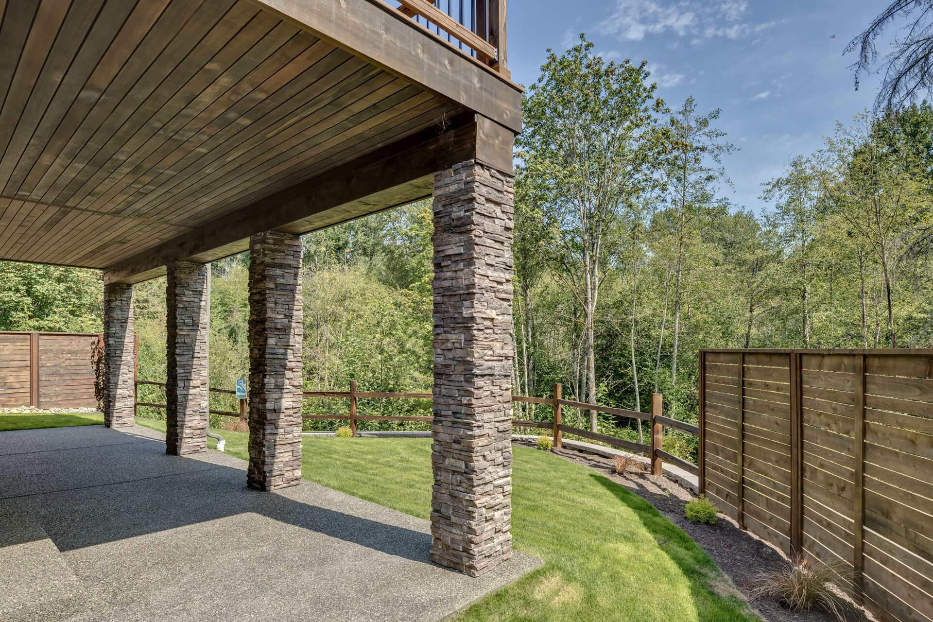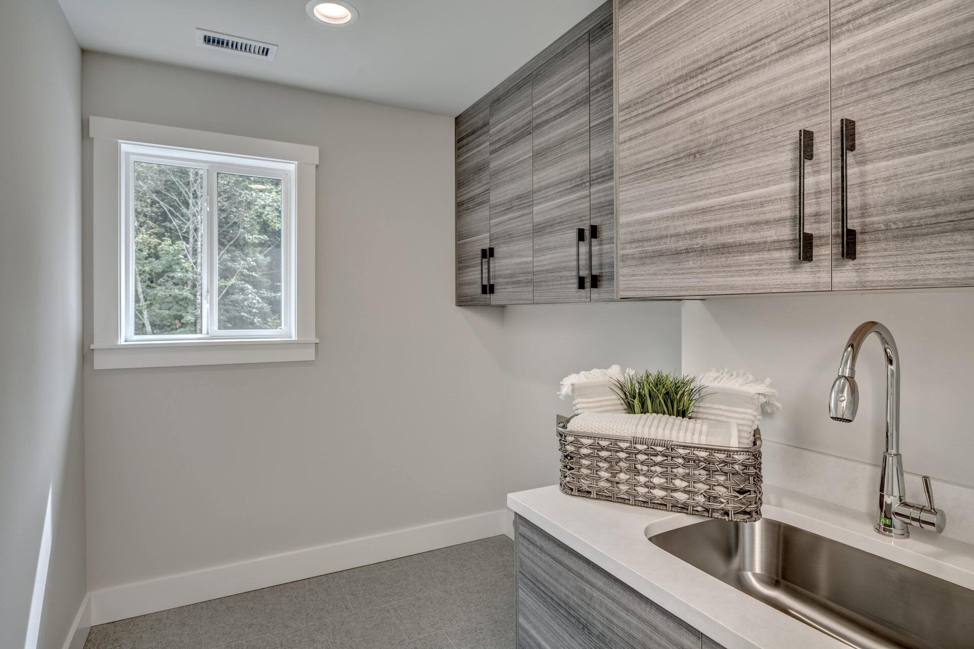 The home features floor to ceiling windows and glass doors, creating a nature’s get away feel for the homeowners and an escape from the hustle and bustle of city life. The open layout provides ideal sight-lines throughout the main living area. Custom built kitchen is the highlight of this home featuring dark stained flat panel cabinetry and marble looking quartz countertops, creating an ideal space for a weekend entertainment or a busy Monday morning. Minimal and contrasting features of the backsplash, countertops and cabinetry gives the space a clean and striking look.