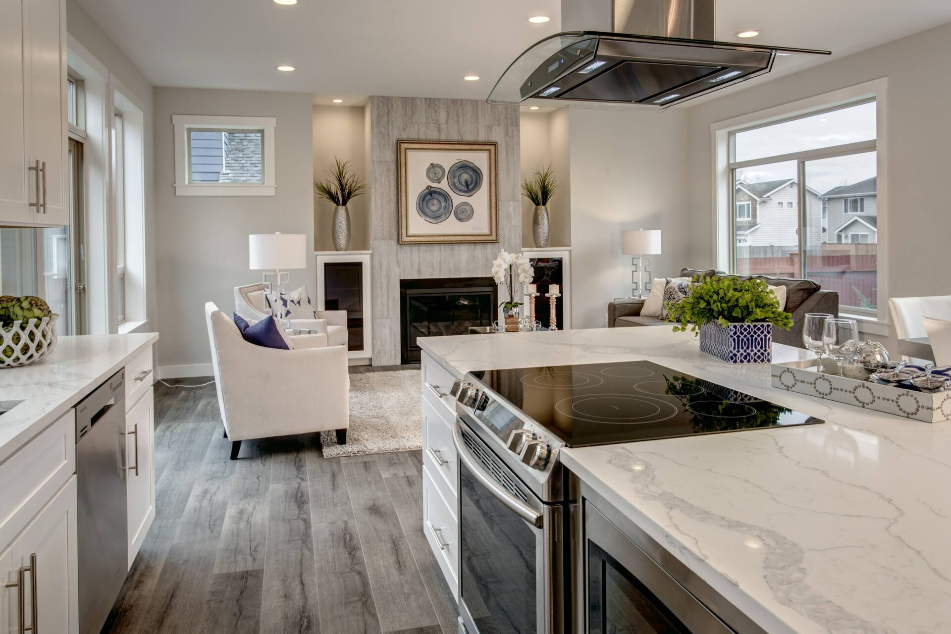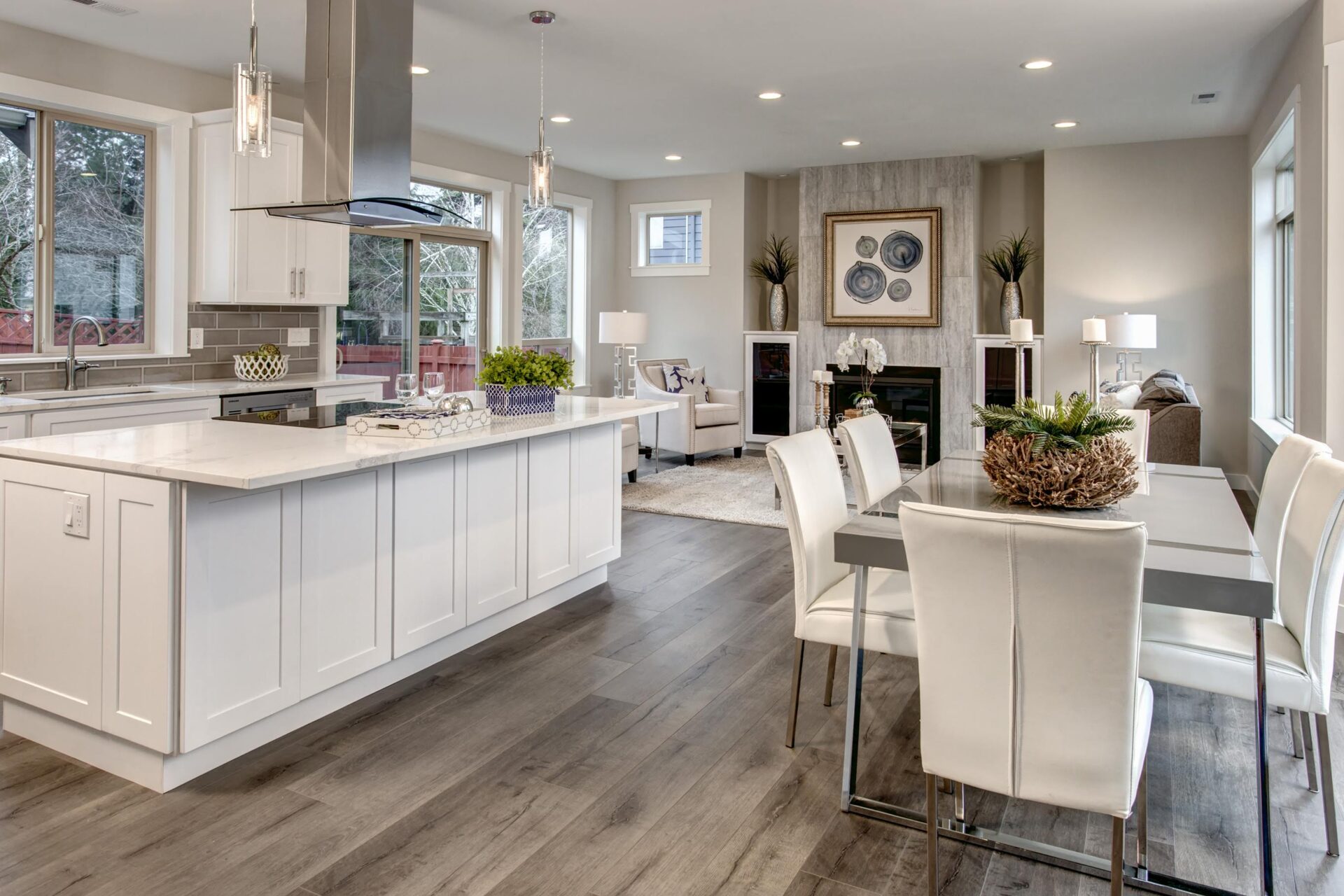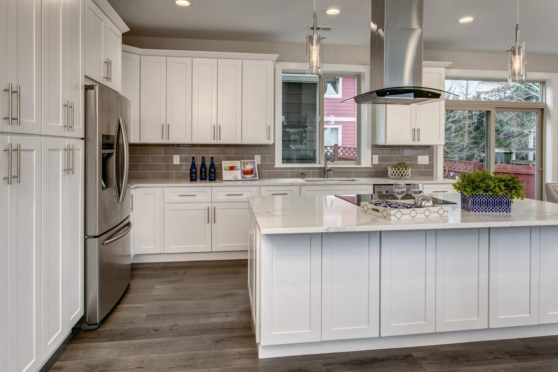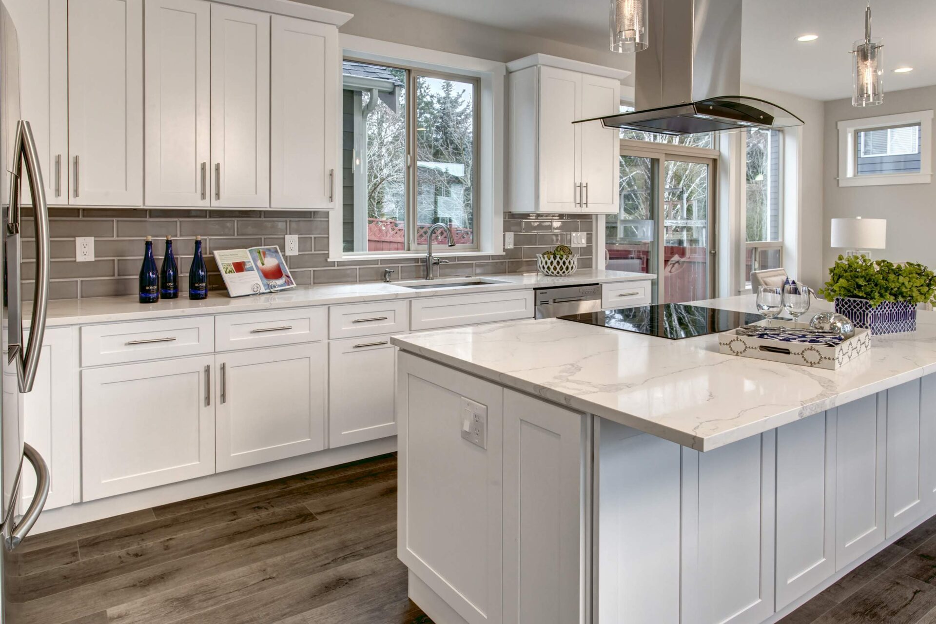 A Renton home we build from the ground up in a transitional style implementing a traditional exterior with a modern interior. An open floor plan of the kitchen and living room creates a bright and spacious area. This custom build home has beautiful grey hardwood floors throughout the main living area. A simple design of white shakers style cabinetry gives this kitchen a classic look topped with white marble looking quartz countertops for elegance and convenience. Modern subway tile backsplash for ease of maintenance. An inviting ribbon fireplace accenting the living room.