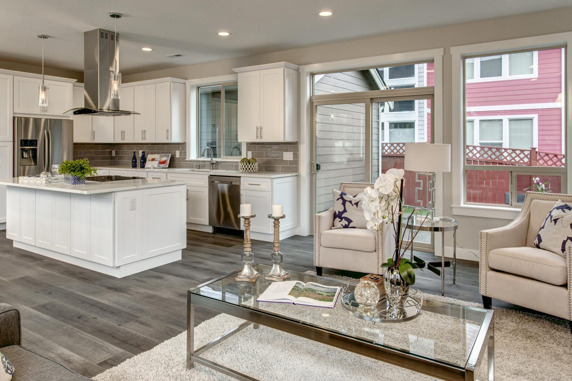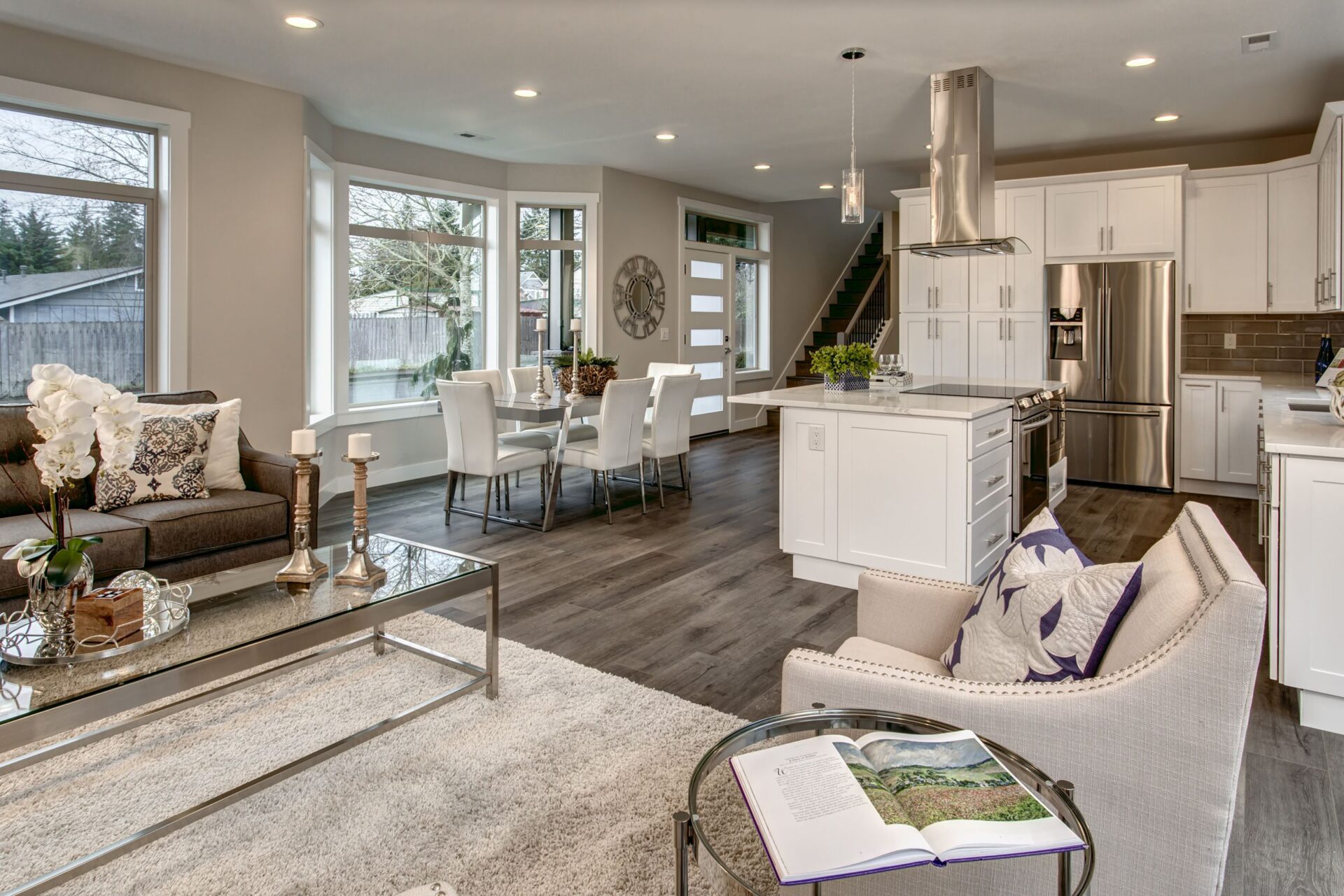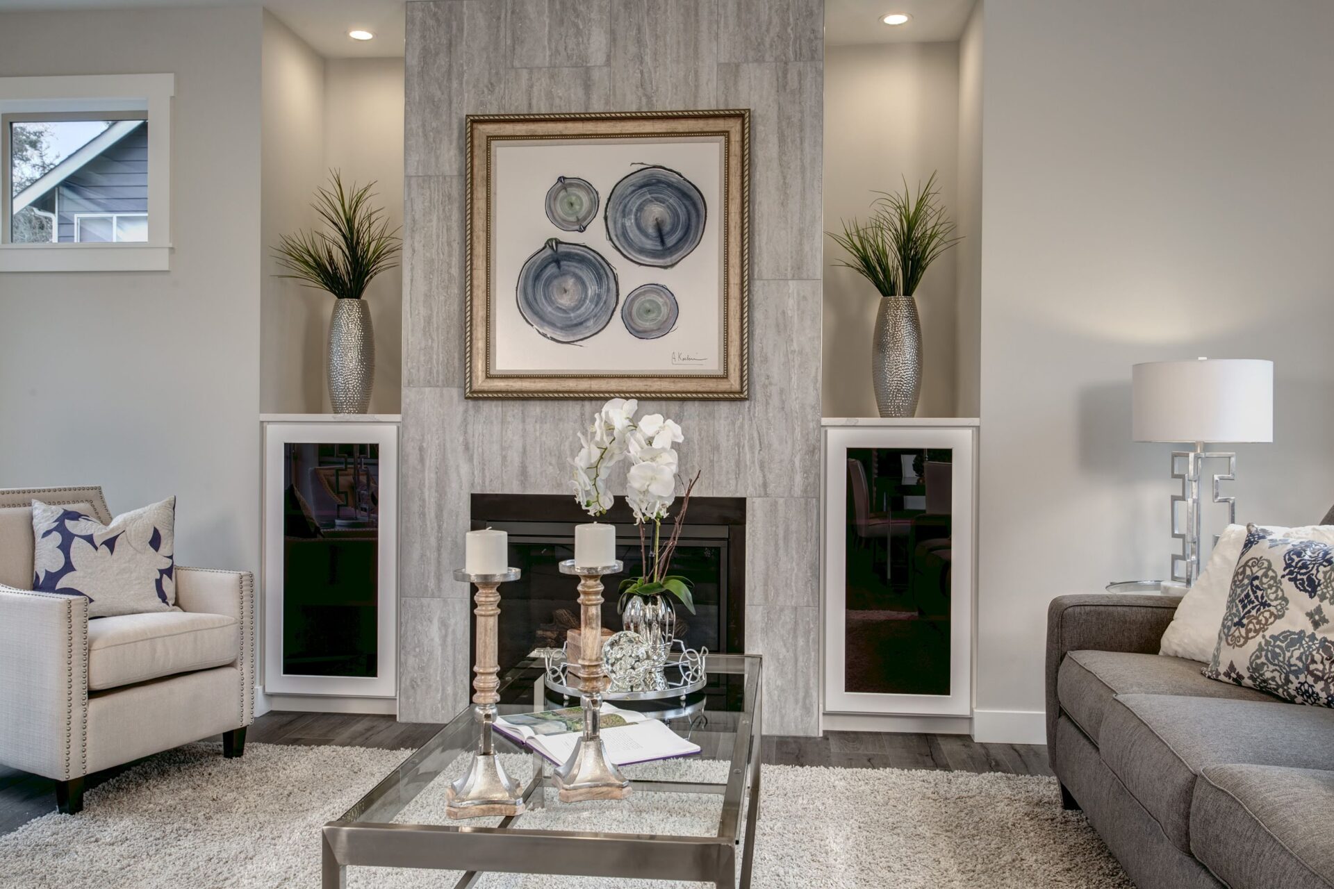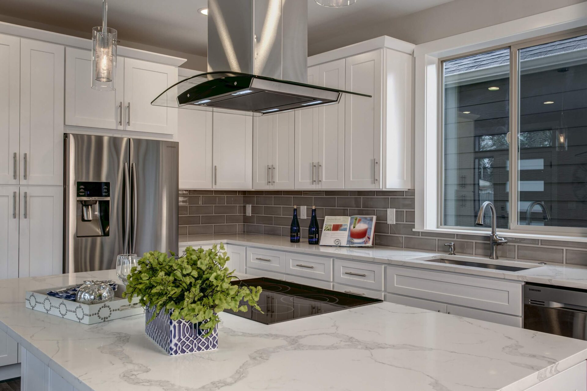 A Renton home we build from the ground up in a transitional style implementing a traditional exterior with a modern interior. An open floor plan of the kitchen and living room creates a bright and spacious area. This custom build home has beautiful grey hardwood floors throughout the main living area. A simple design of white shakers style cabinetry gives this kitchen a classic look topped with white marble looking quartz countertops for elegance and convenience. Modern subway tile backsplash for ease of maintenance. An inviting ribbon fireplace accenting the living room.