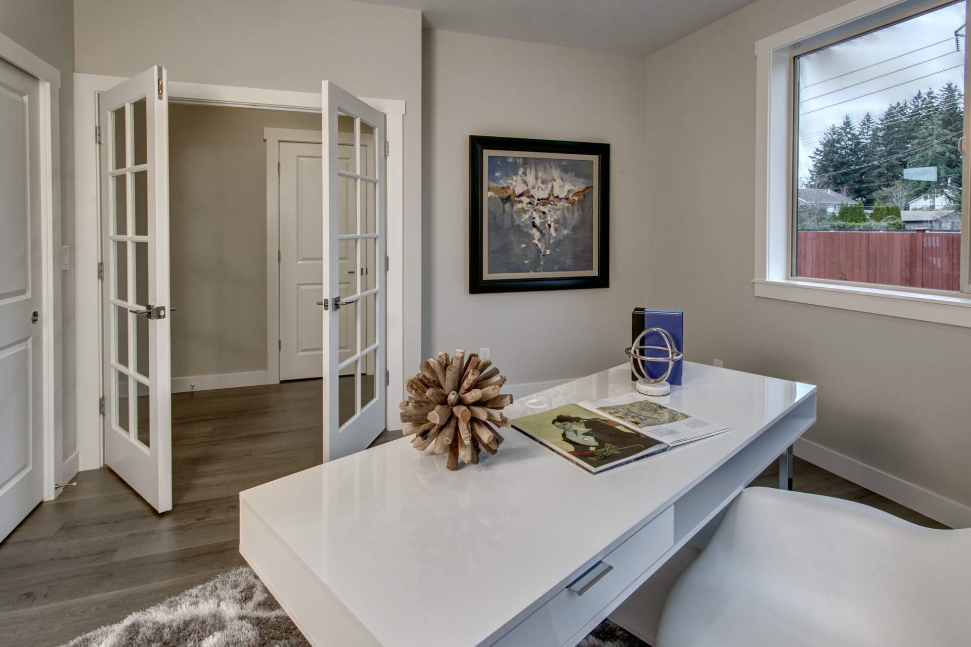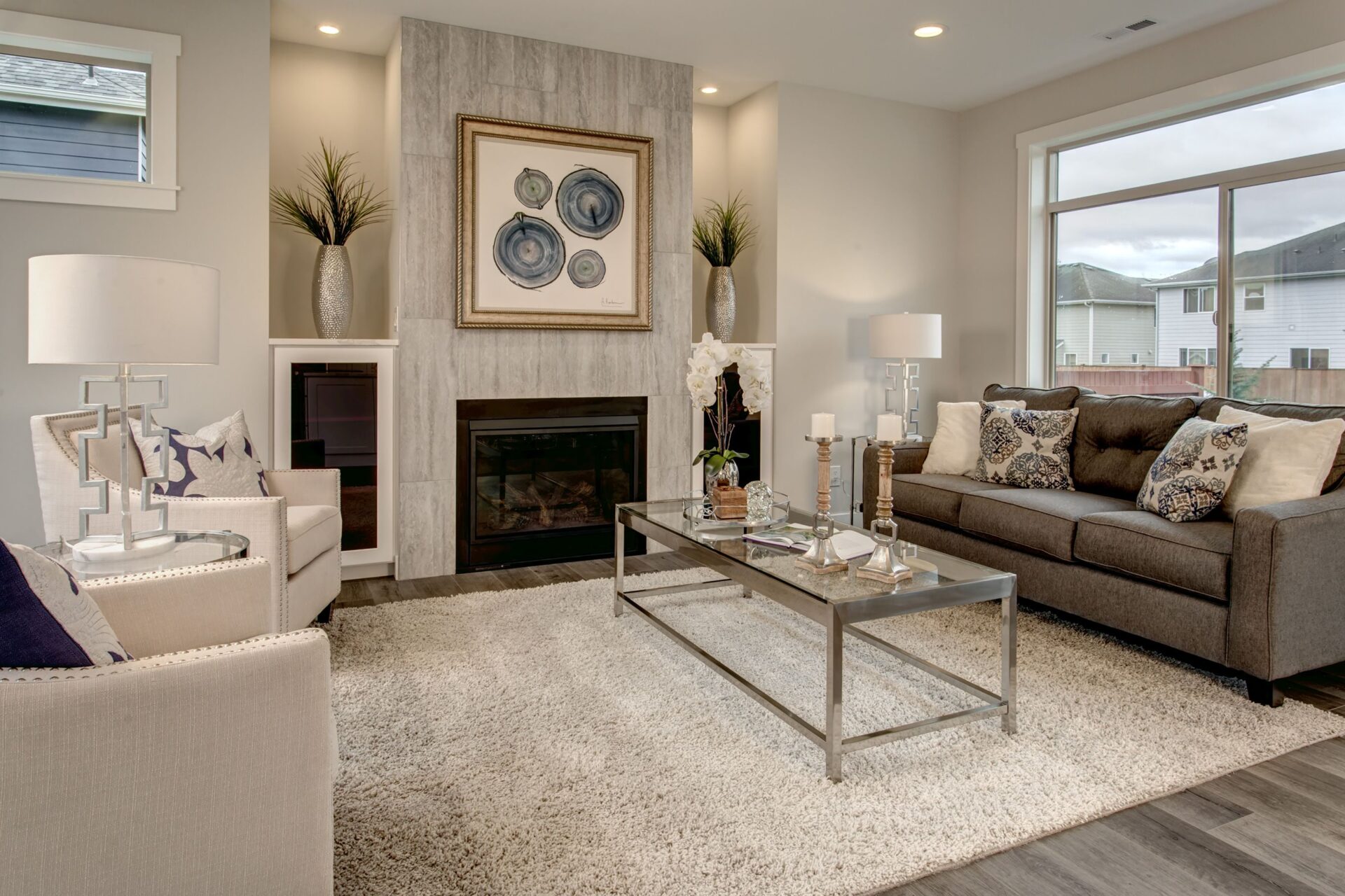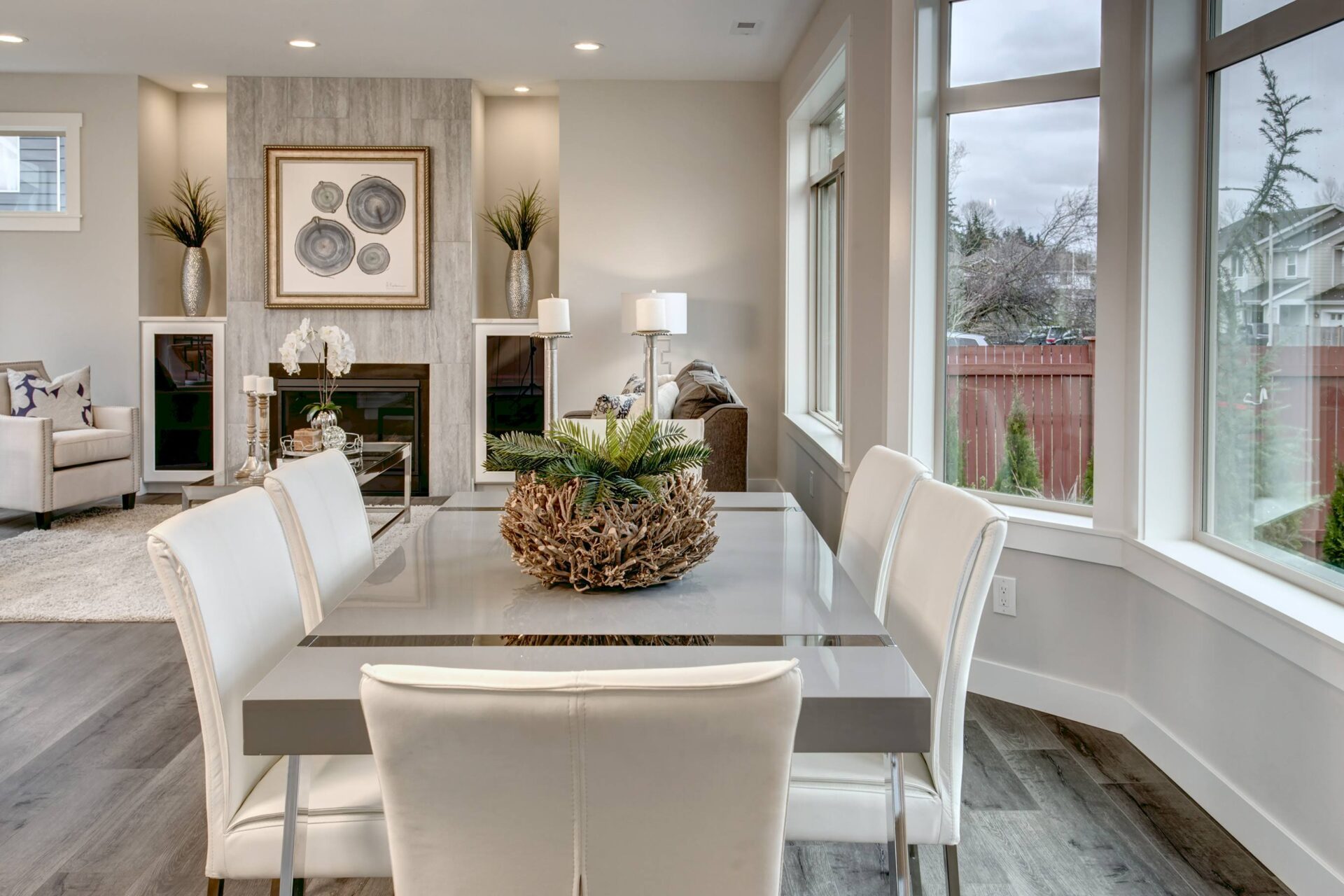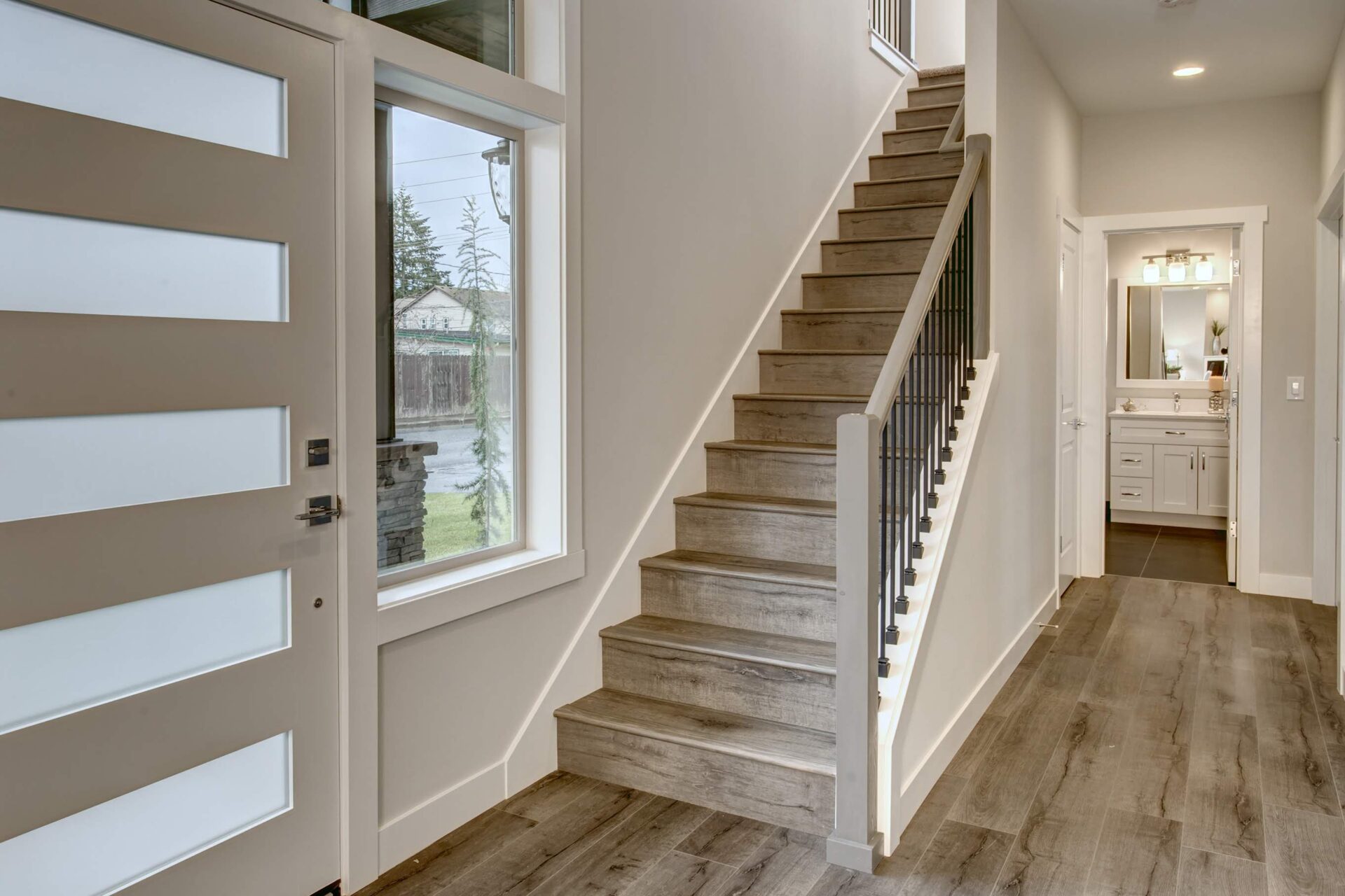 A Renton home we build from the ground up in a transitional style implementing a traditional exterior with a modern interior. An open floor plan of the kitchen and living room creates a bright and spacious area. This custom build home has beautiful grey hardwood floors throughout the main living area. A simple design of white shakers style cabinetry gives this kitchen a classic look topped with white marble looking quartz countertops for elegance and convenience. Modern subway tile backsplash for ease of maintenance. An inviting ribbon fireplace accenting the living room.