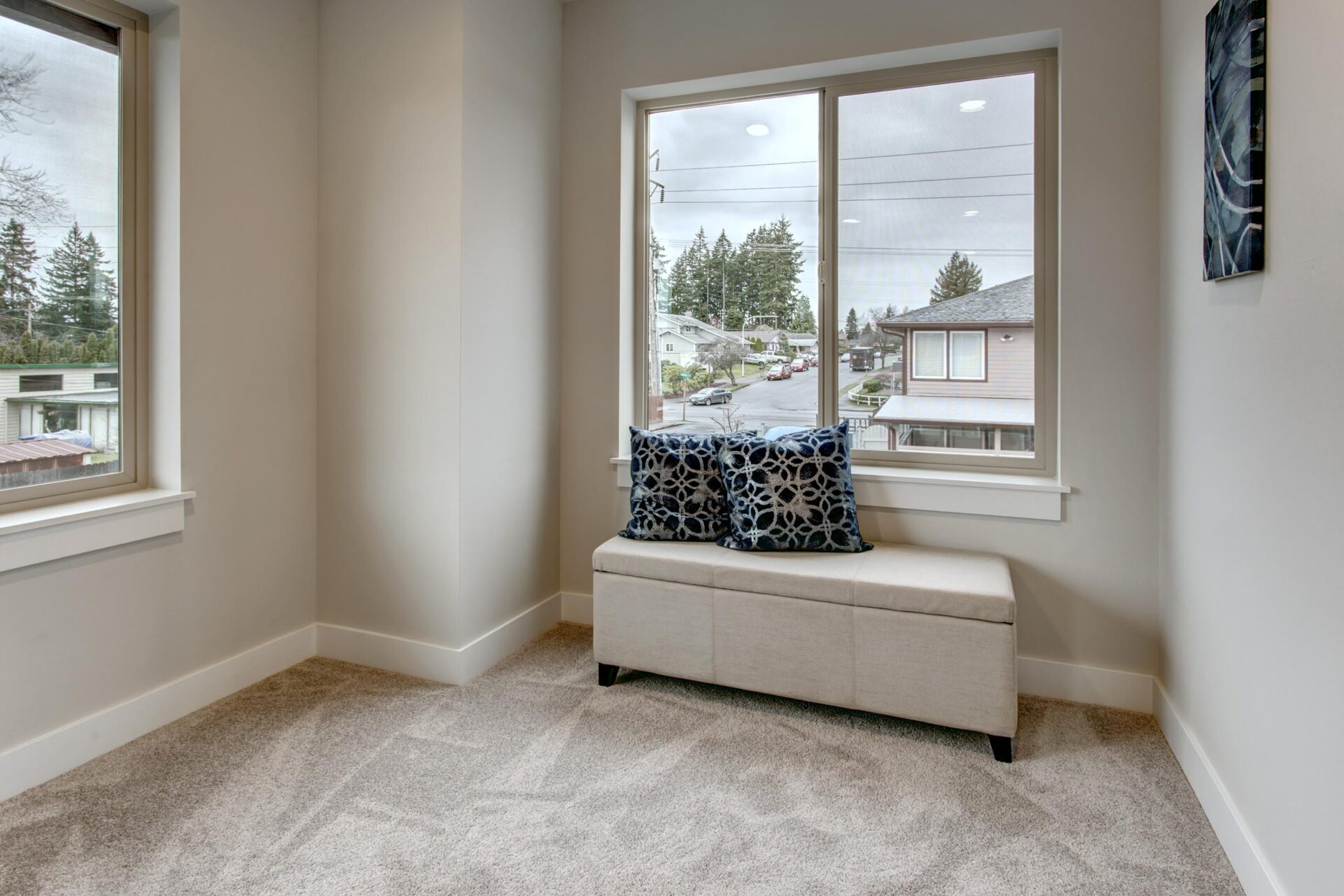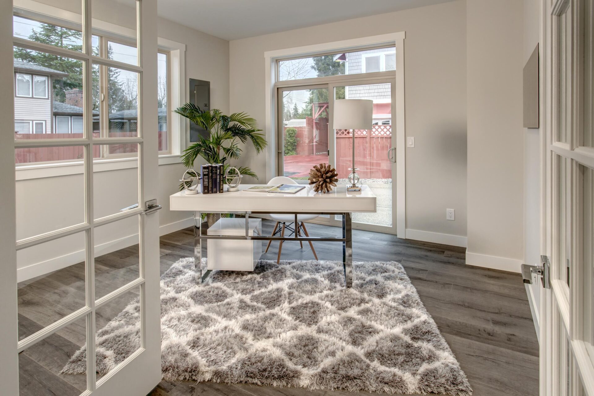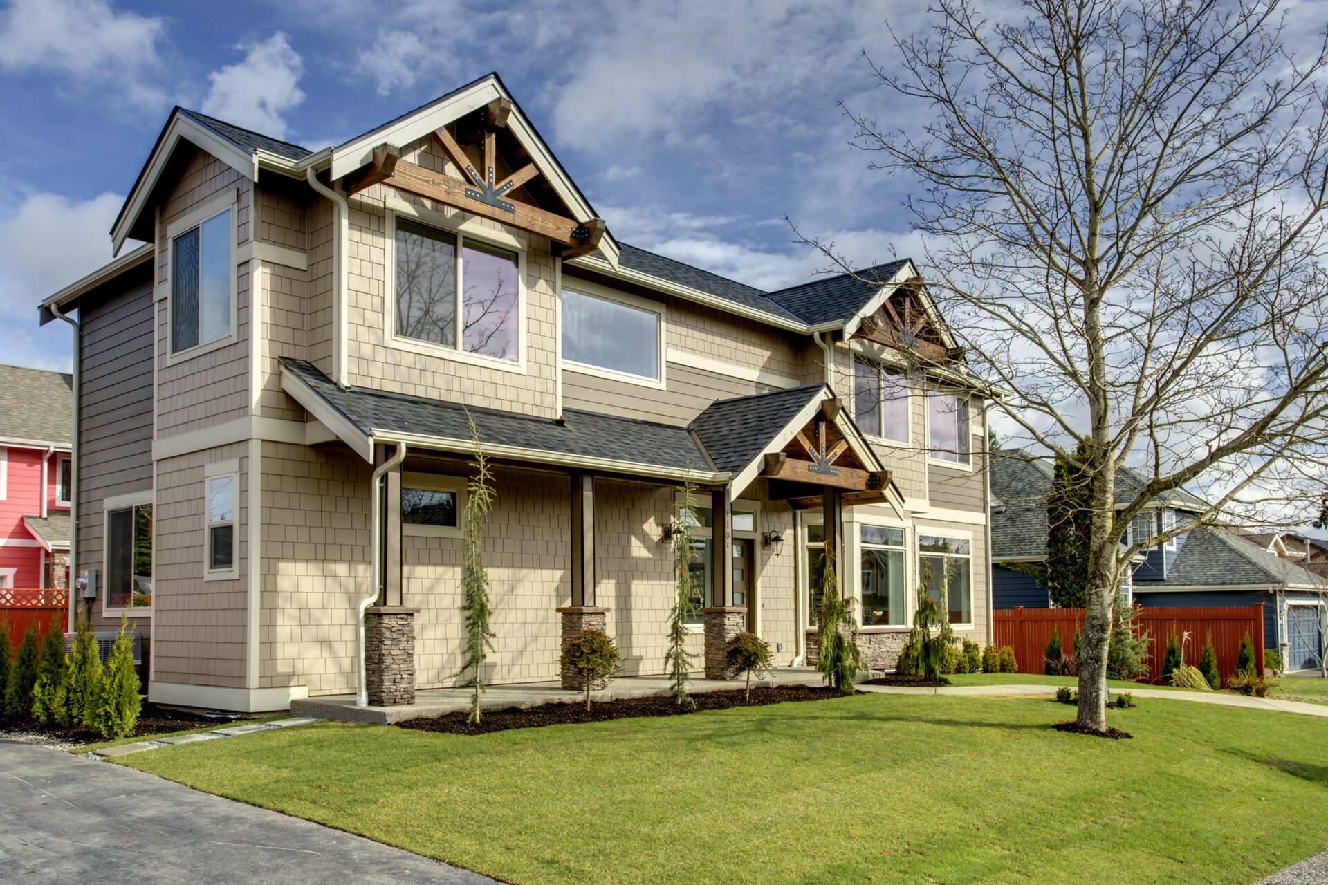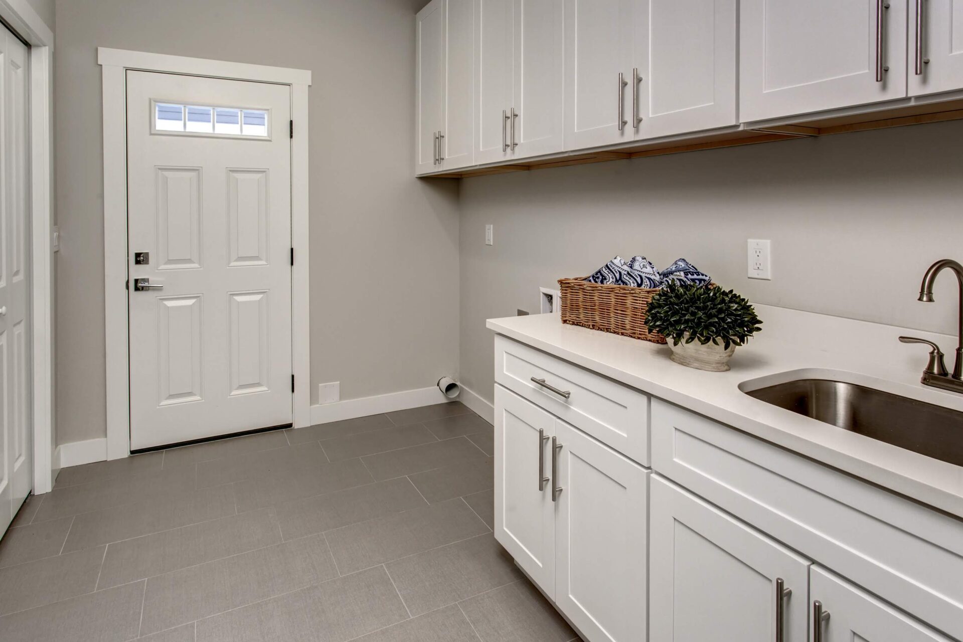 A Renton home we build from the ground up in a transitional style implementing a traditional exterior with a modern interior. An open floor plan of the kitchen and living room creates a bright and spacious area. This custom build home has beautiful grey hardwood floors throughout the main living area. A simple design of white shakers style cabinetry gives this kitchen a classic look topped with white marble looking quartz countertops for elegance and convenience. Modern subway tile backsplash for ease of maintenance. An inviting ribbon fireplace accenting the living room.