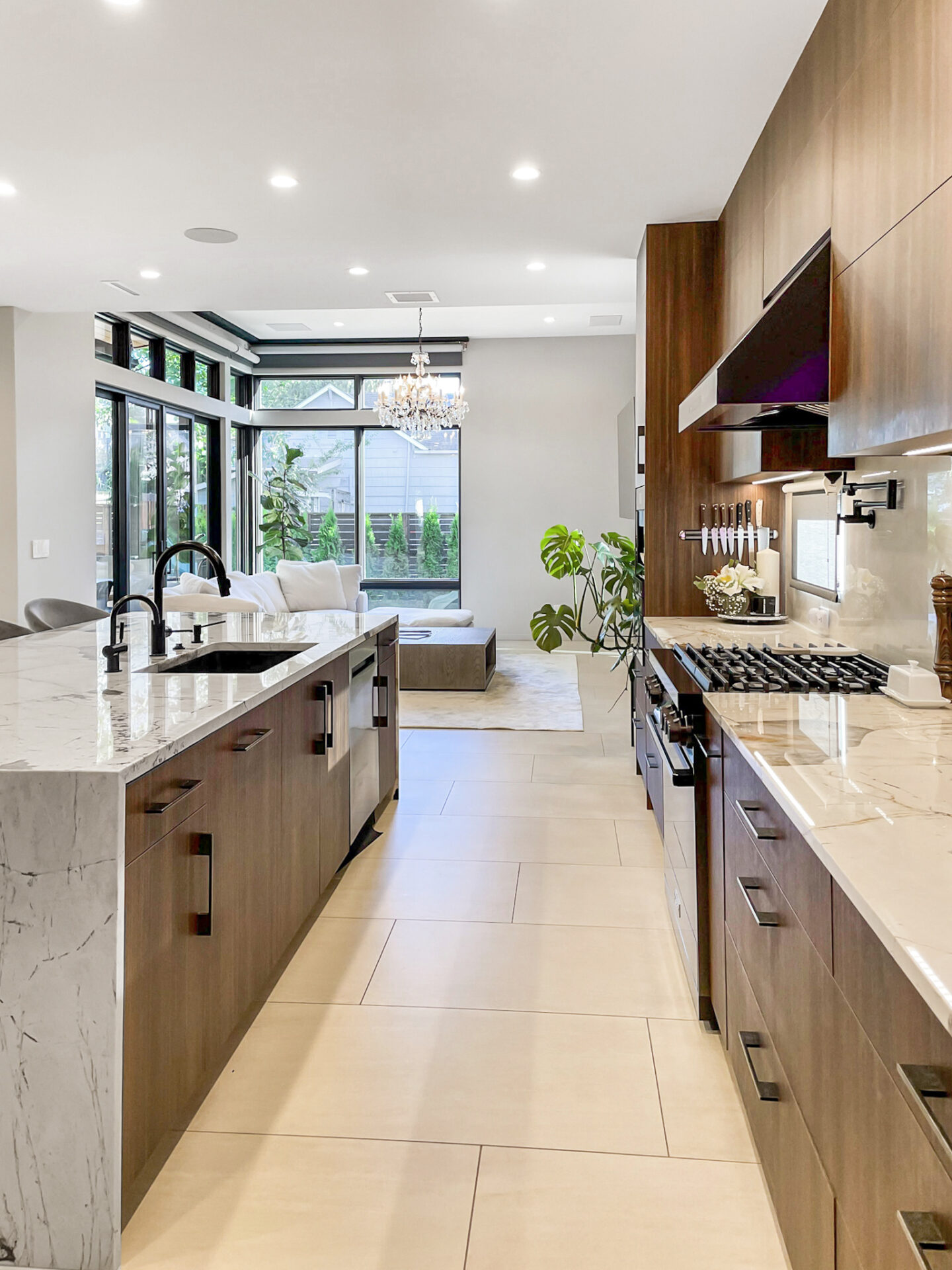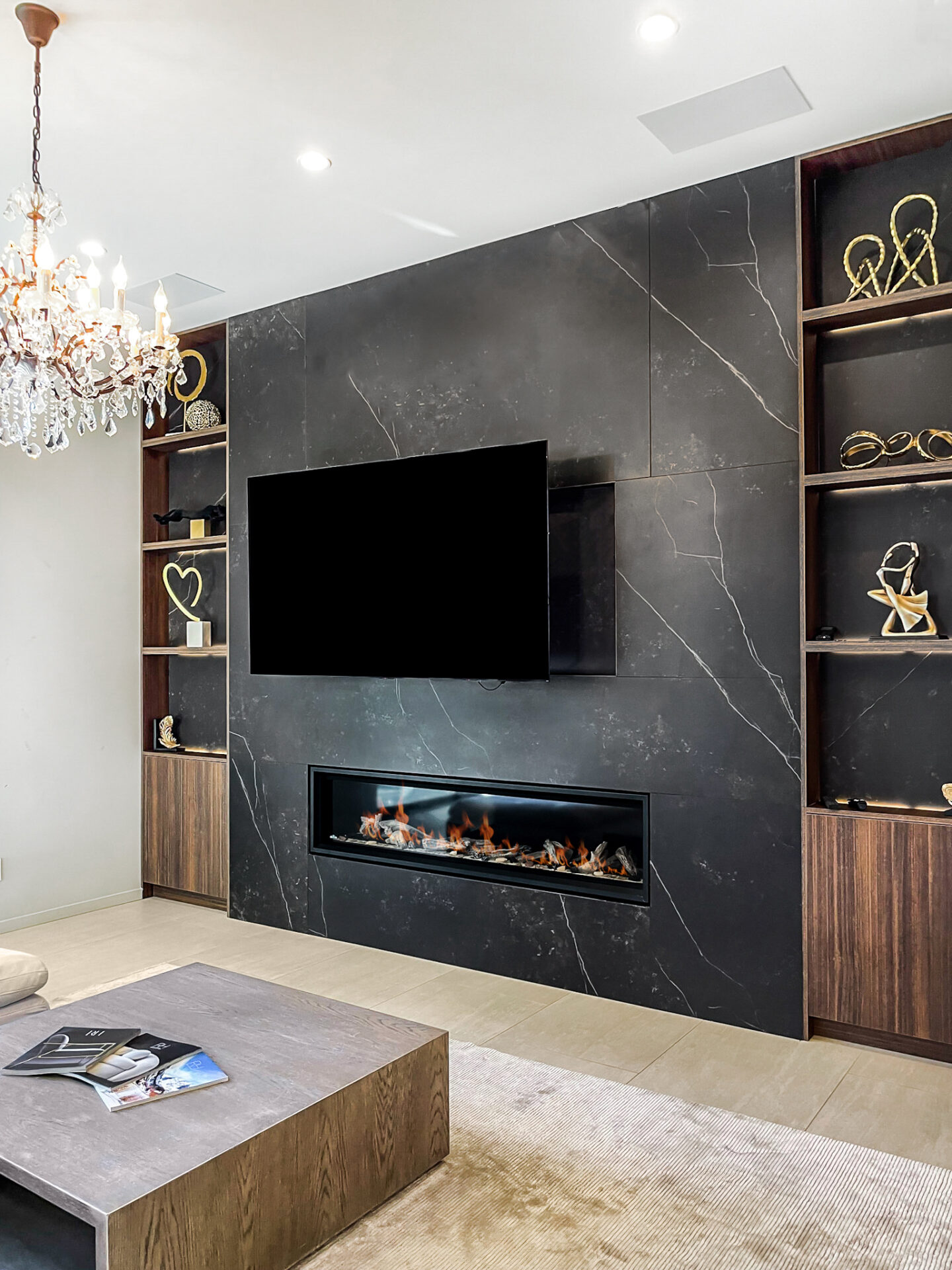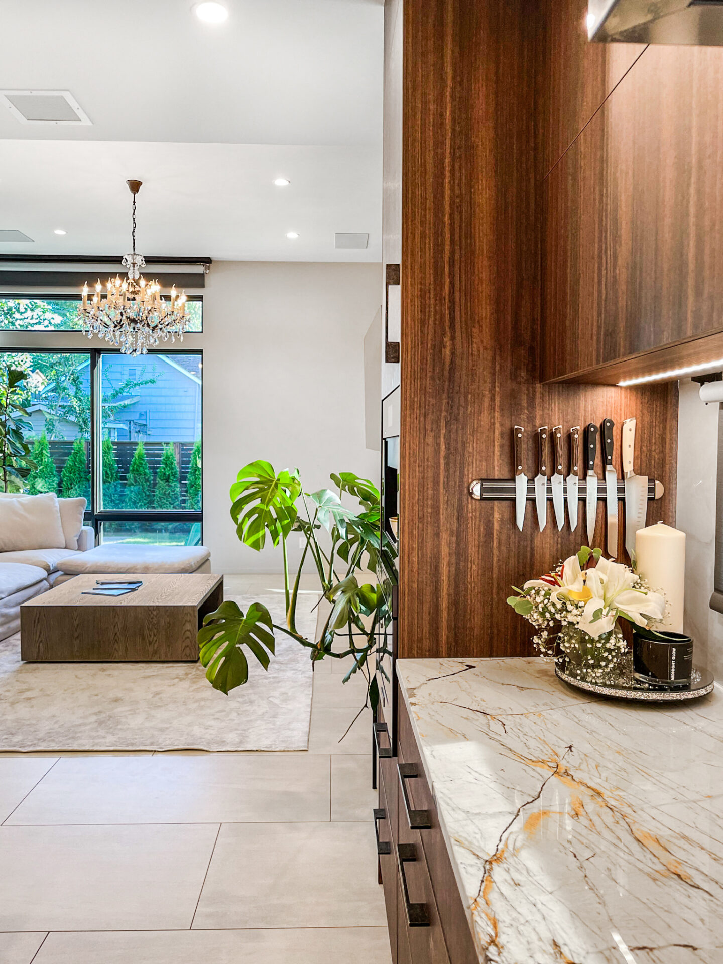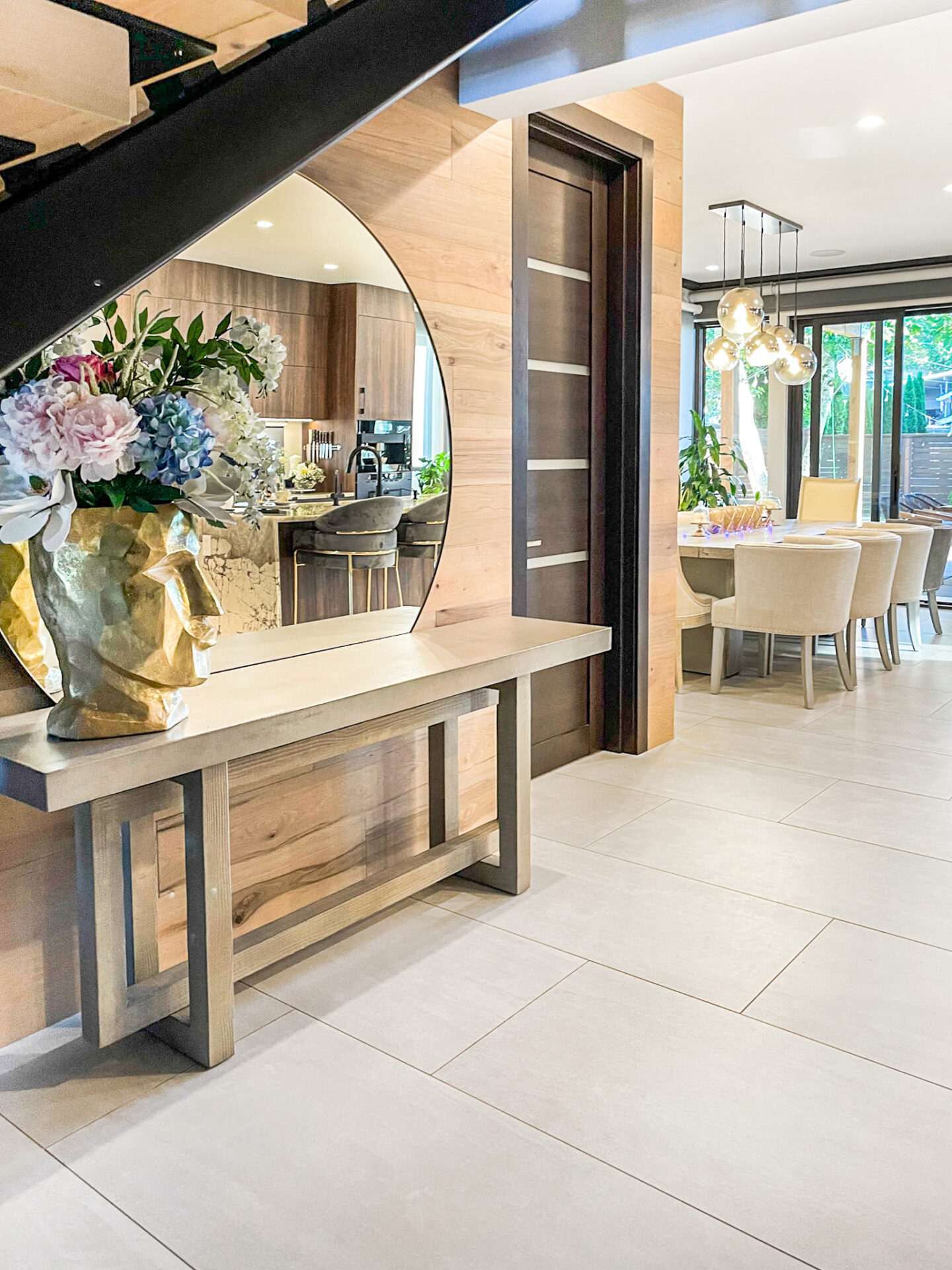 We’ve built a new home in Renton, from the ground up with a contemporary style that seamlessly integrates a modern interior. The kitchen and living room boast an open floor plan, fostering a bright and expansive atmosphere. The main living area is adorned with exquisite porcelain tile, offering both beauty and practicality. The kitchen features rich warm brown cabinets and a striking accent stone island, contributing to a captivating and glamorous ambiance. A standout feature in the house is the Laurent Dekton fireplace, serving as a focal point where the family can gather and create lasting memories.