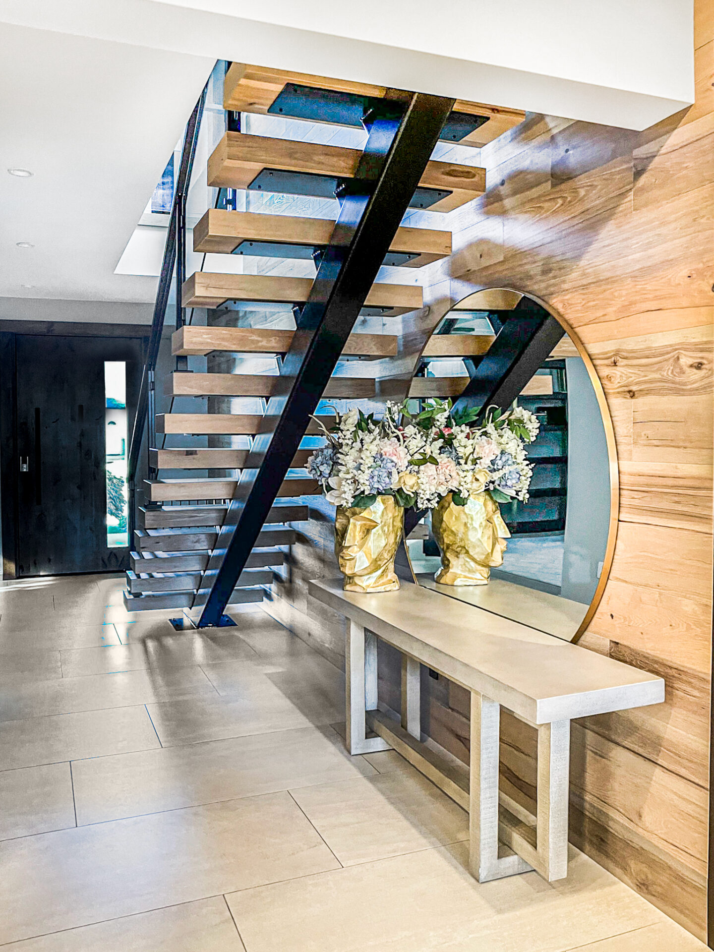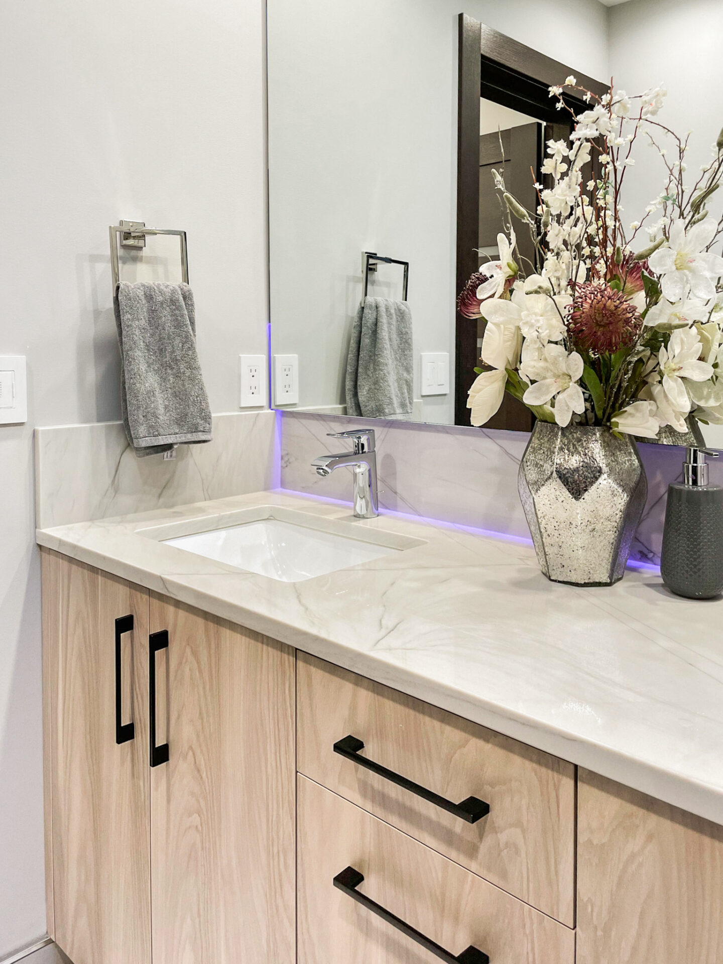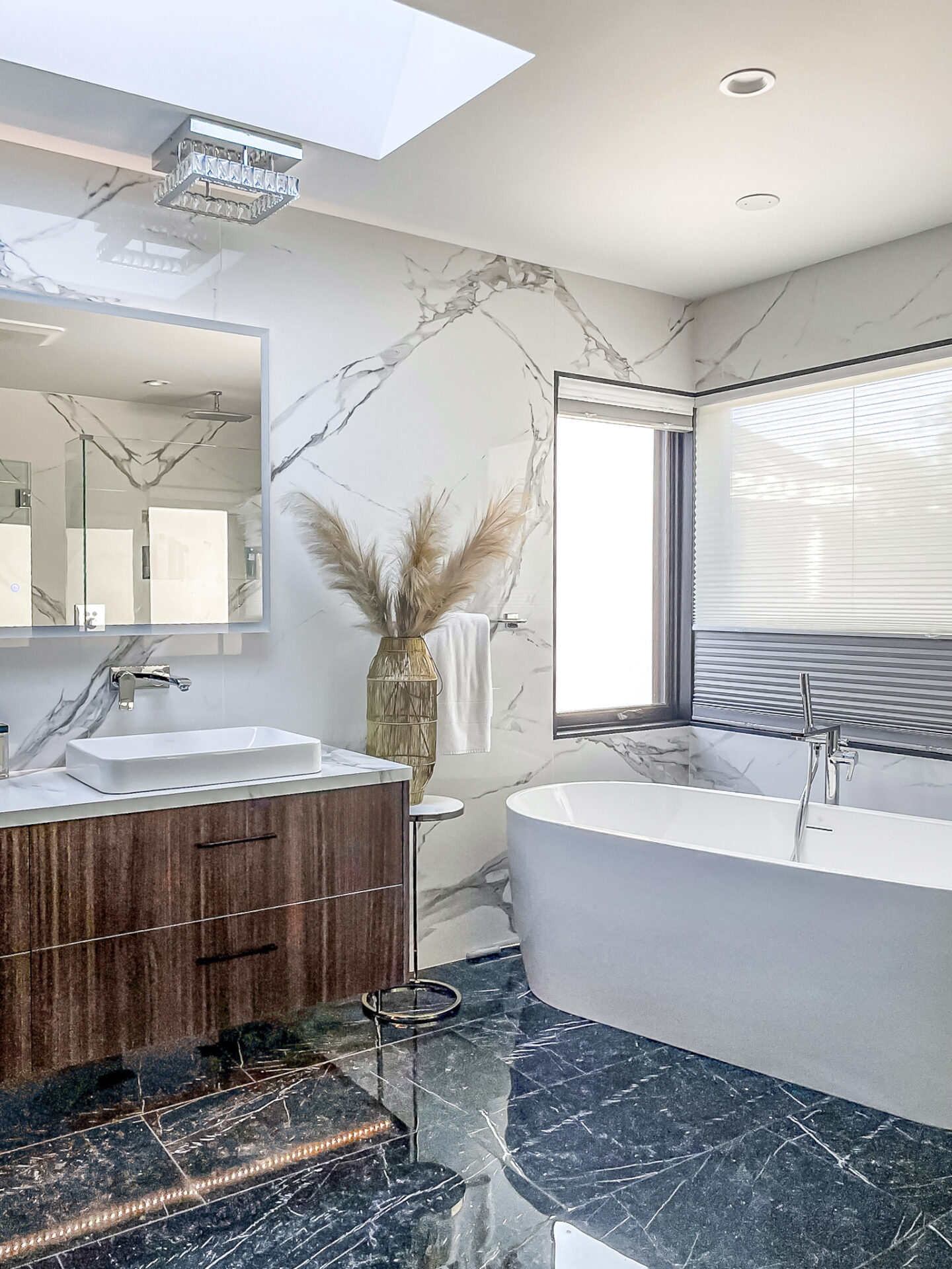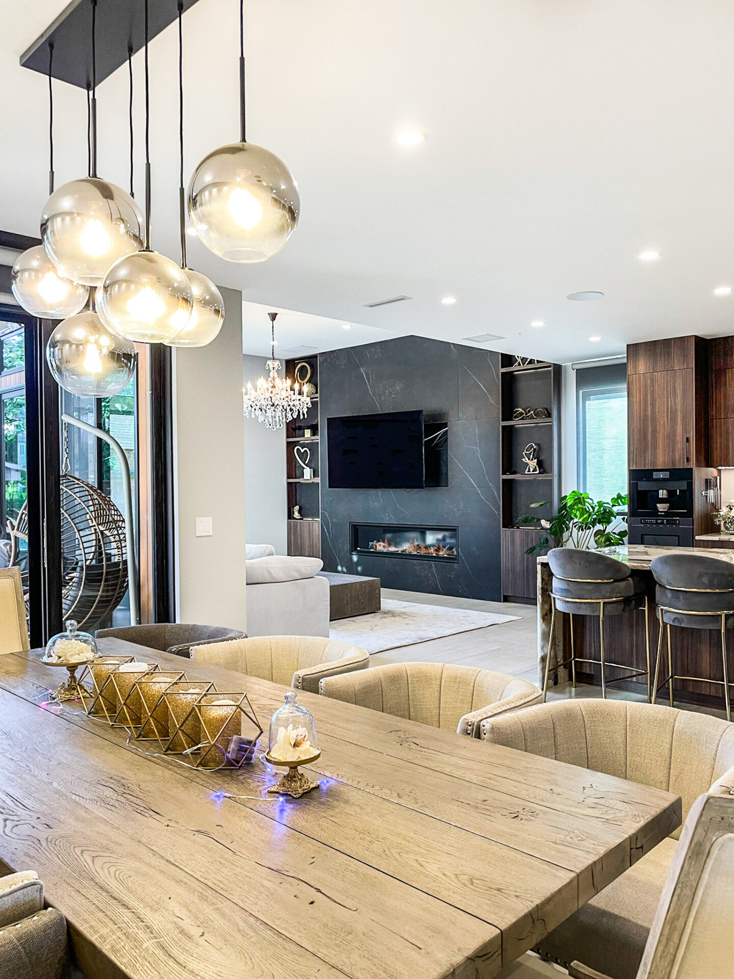 We’ve built a new home in Renton, from the ground up with a contemporary style that seamlessly integrates a modern interior. The kitchen and living room boast an open floor plan, fostering a bright and expansive atmosphere. The main living area is adorned with exquisite porcelain tile, offering both beauty and practicality. The kitchen features rich warm brown cabinets and a striking accent stone island, contributing to a captivating and glamorous ambiance. A standout feature in the house is the Laurent Dekton fireplace, serving as a focal point where the family can gather and create lasting memories.