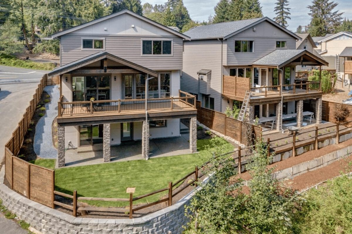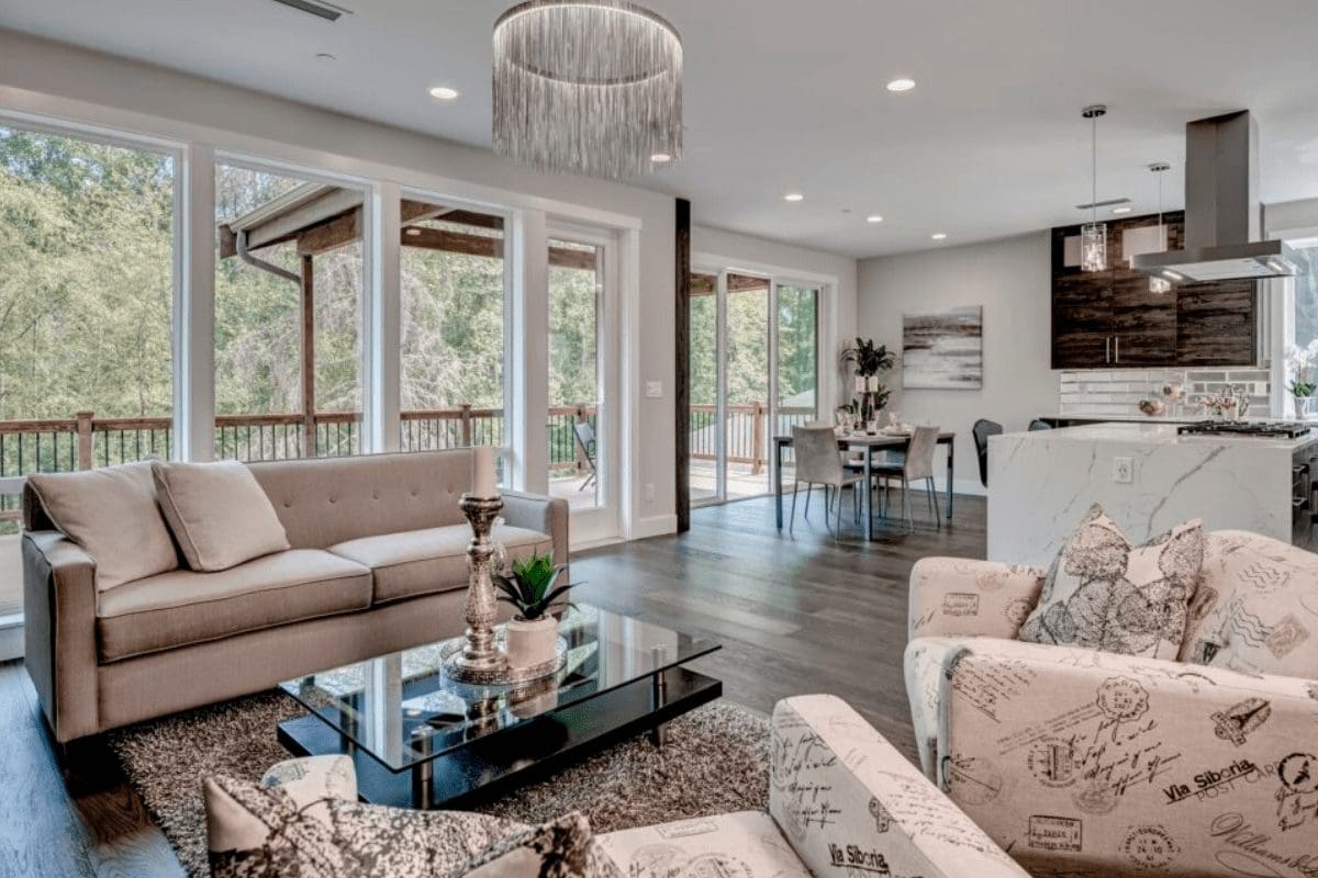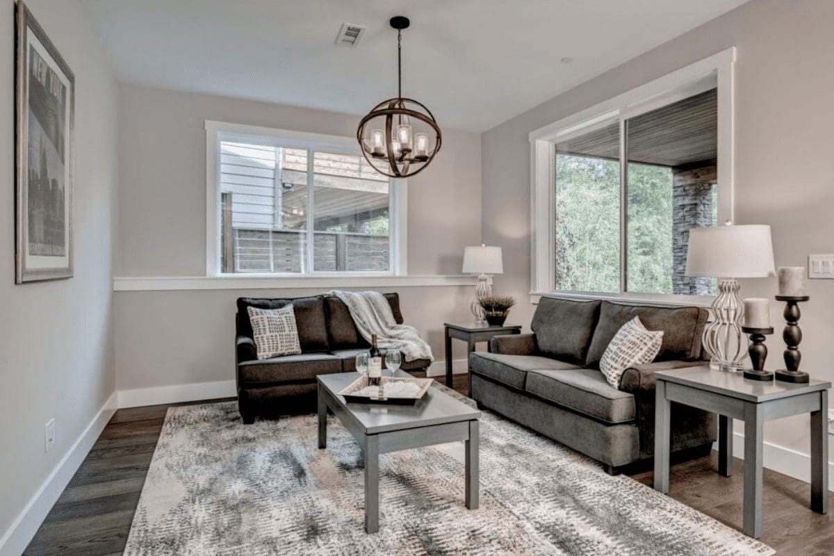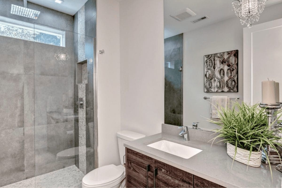 The home features floor to ceiling windows and glass doors, creating a nature’s get away feel for the homeowners and an escape from the hustle and bustle of city life. The open layout provides ideal sight-lines throughout the main living area. Custom built kitchen is the highlight of this home featuring dark stained flat panel cabinetry and marble looking quartz countertops, creating an ideal space for a weekend entertainment or a busy Monday morning. Minimal and contrasting features of the backsplash, countertops and cabinetry gives the space a clean and striking look.