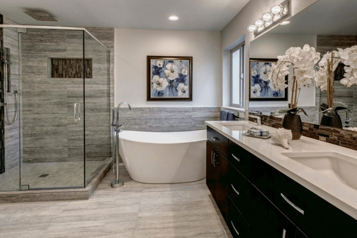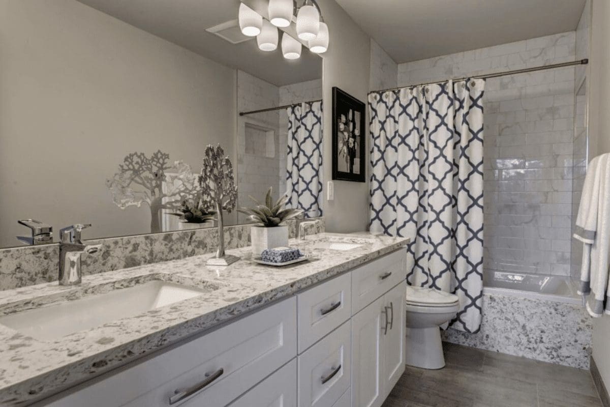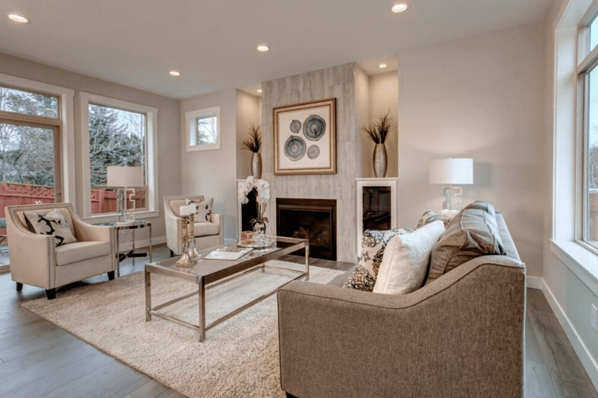 A Renton home we build from the ground up in a transitional style implementing a traditional exterior with a modern interior. An open floor plan of the kitchen and living room creates a bright and spacious area. This custom build home has beautiful grey hardwood floors throughout the main living area. A simple design of white shakers style cabinetry gives this kitchen a classic look topped with white marble looking quartz countertops for elegance and convenience. Modern subway tile backsplash for ease of maintenance. An inviting ribbon fireplace accenting the living room.