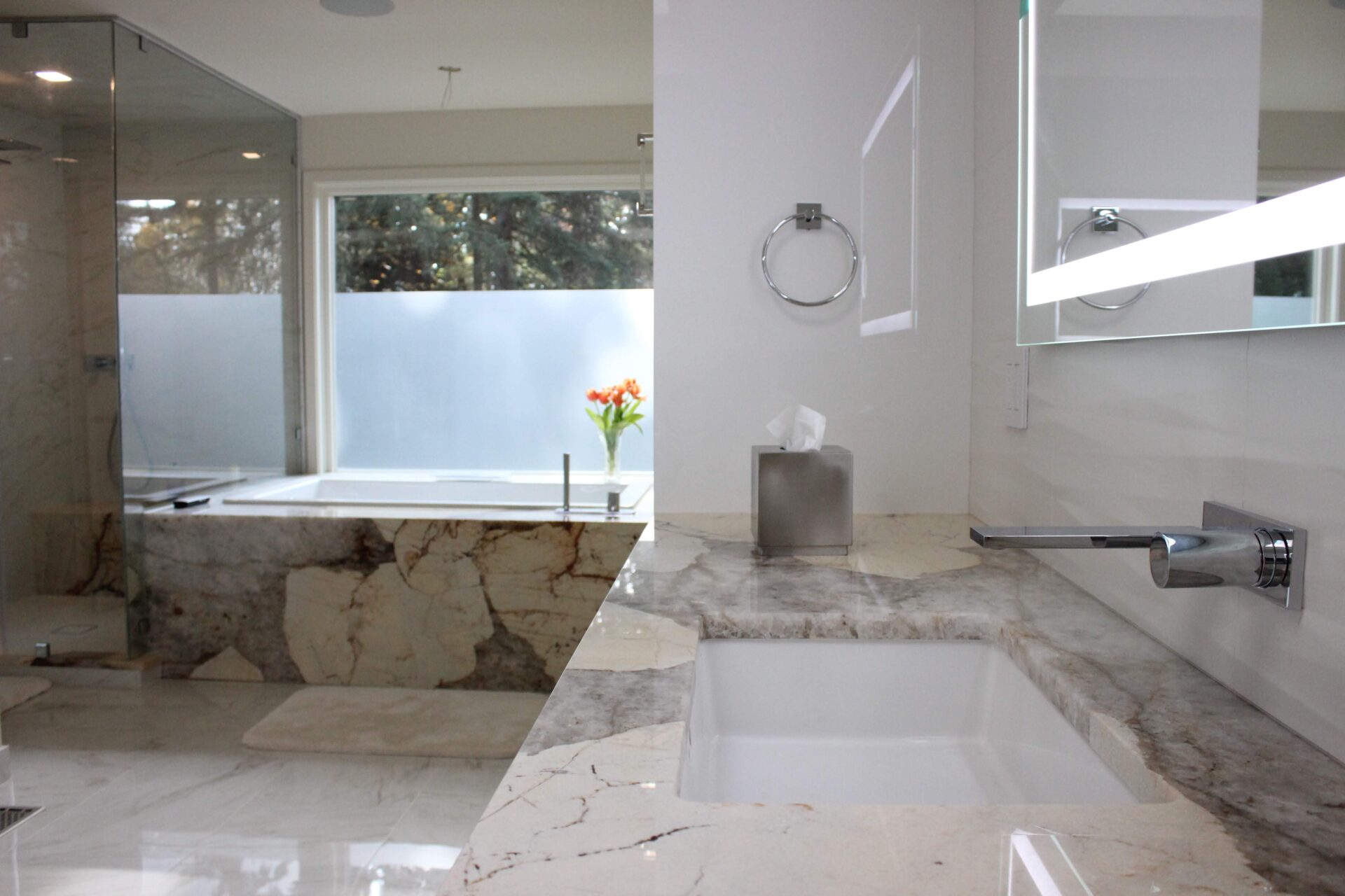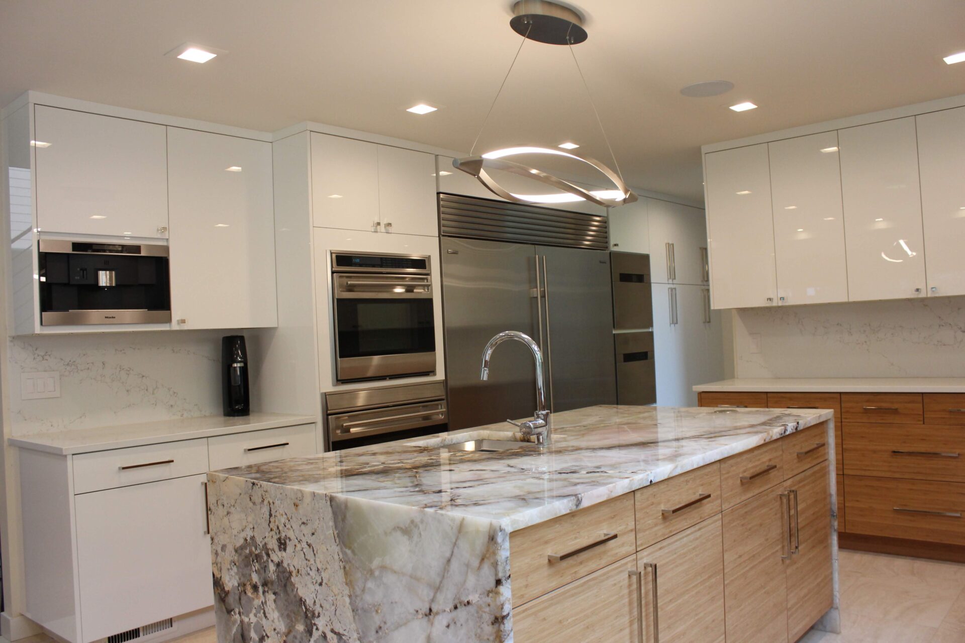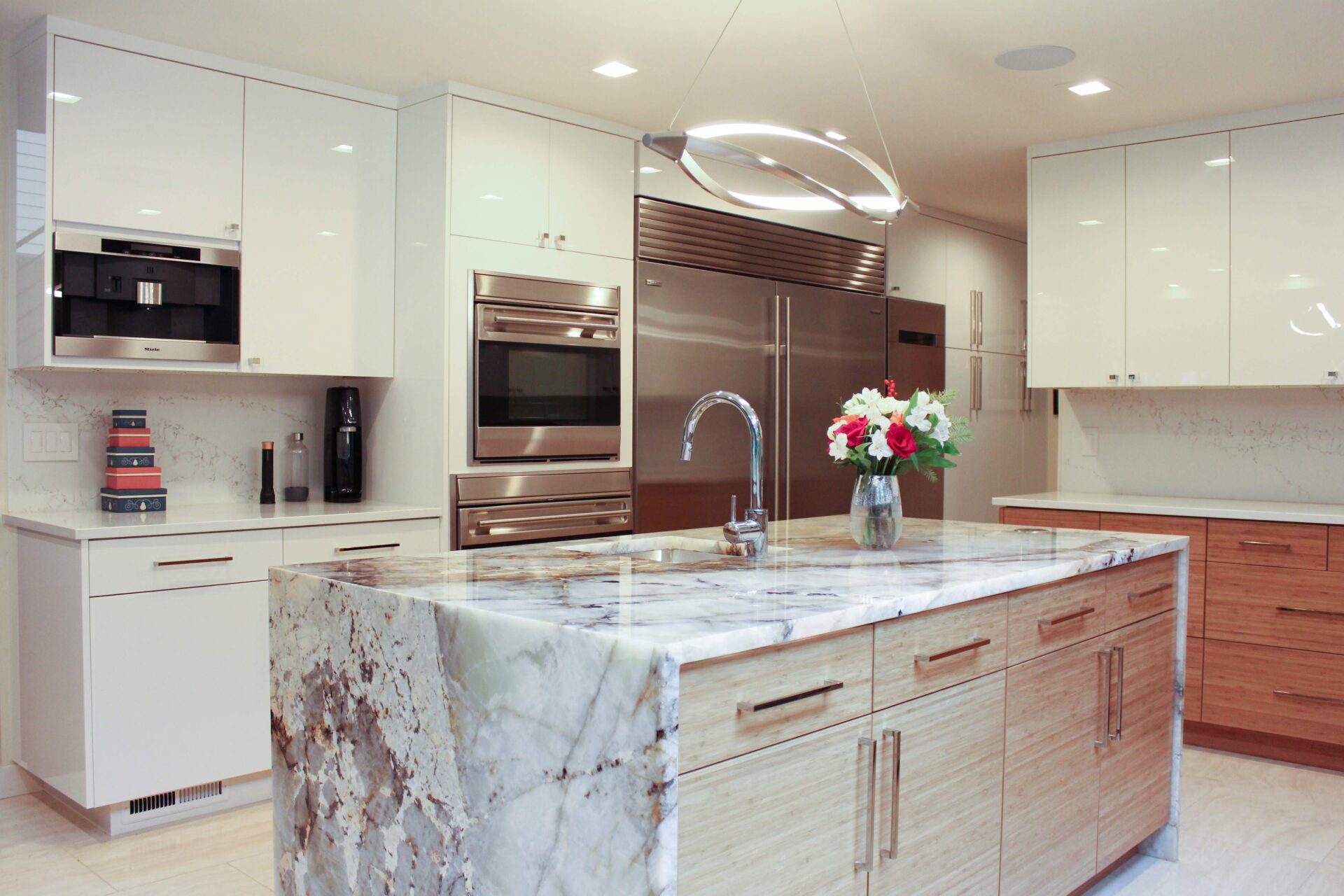 A mixture of custom built flat panel cabinetry covered with striking natural stone accenting the stove backsplash and the island with waterfalls making them the focal point of this beautiful space. The perimeter of the kitchen is lined with a faint marble looking countertops with full stone backsplash and waterfall giving this kitchen a clean and contemporary look. Quartz and natural stone is used throughout the home.