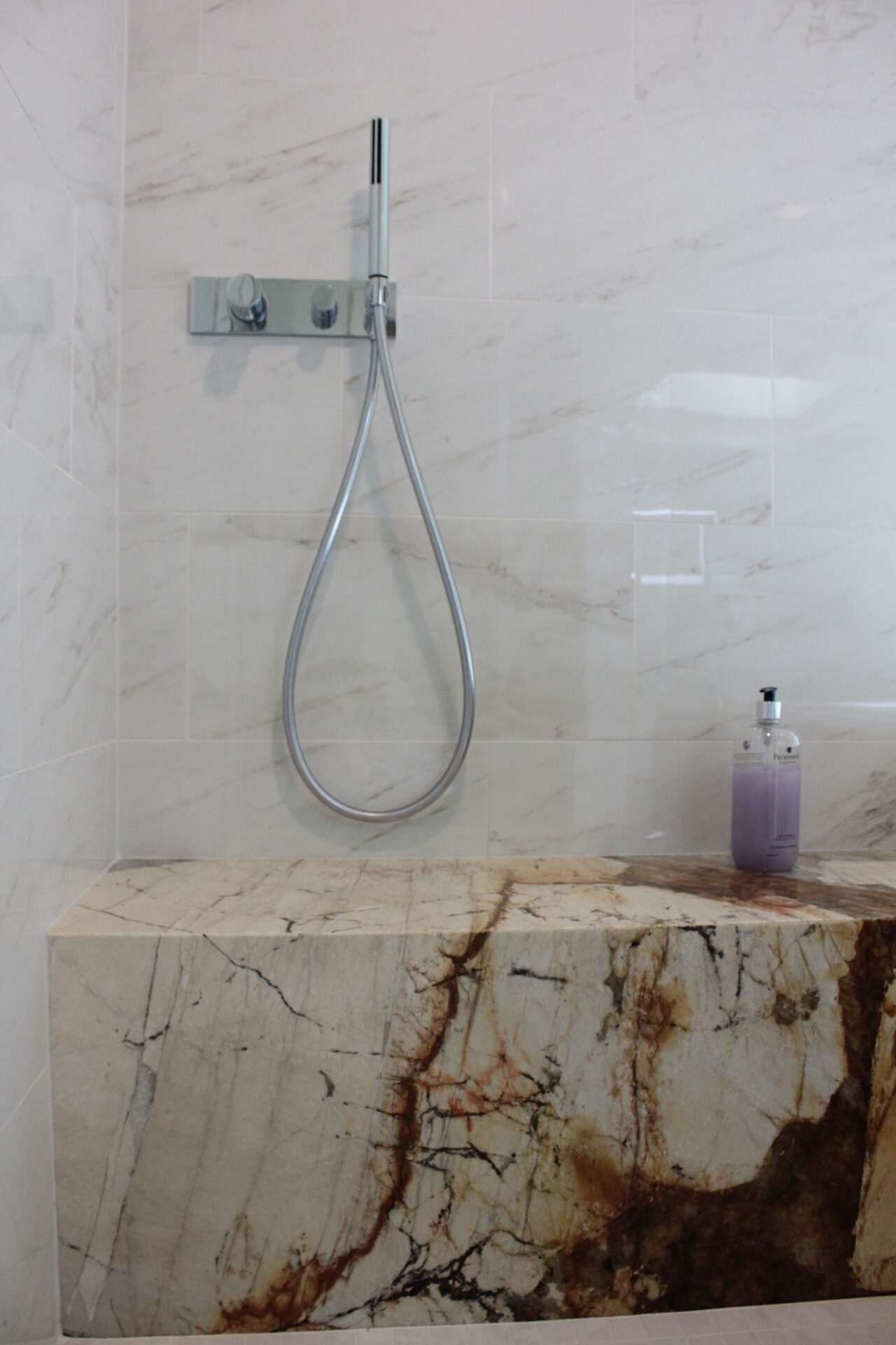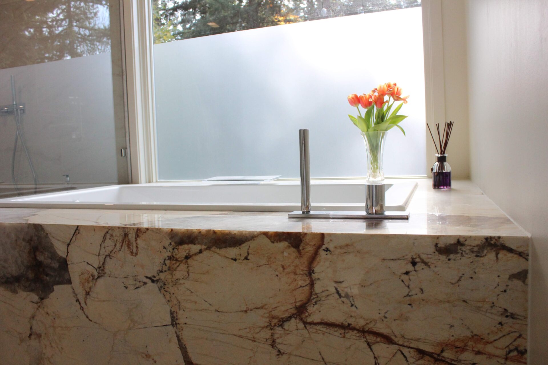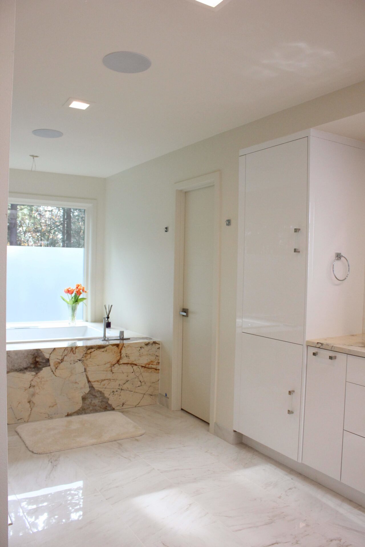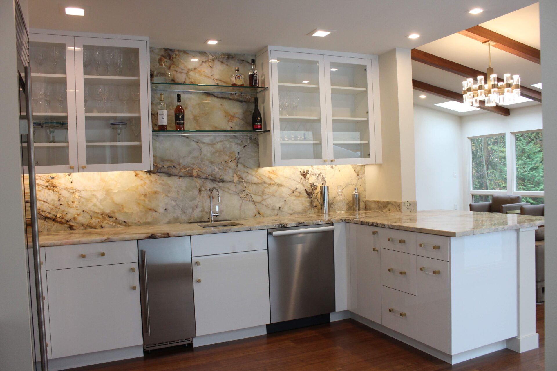 A mixture of custom built flat panel cabinetry covered with striking natural stone accenting the stove backsplash and the island with waterfalls making them the focal point of this beautiful space. The perimeter of the kitchen is lined with a faint marble looking countertops with full stone backsplash and waterfall giving this kitchen a clean and contemporary look. Quartz and natural stone is used throughout the home.