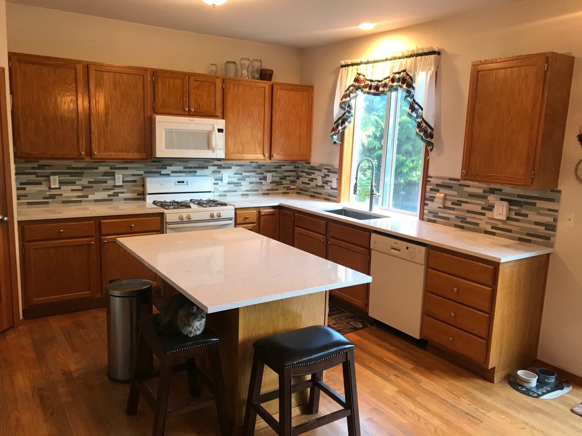 Work description:They demolished our old 1994 laminate countertops and tile backsplash, and put in new Quartz countertops, a tile backsplash, and a new faucet.